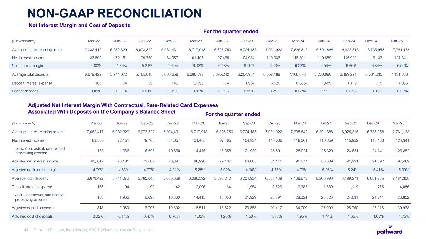 Pathward Financial, Inc. (Nasdaq: CASH) | Quarterly Investor Presentation43 NON-GAAP RECONCILIATION For the quarter ended ($ in thousands) Mar-22 Jun-22 Sep-22 Dec-22 Mar-23 Jun-23 Sep-23 Dec-23 Mar-24 Jun-24 Sep-24 Dec-24 Mar-25 Average interest earning assets 7,082,417 6,082,329 6,073,822 5,934,431 6,717,918 6,326,750 6,724,185 7,031,922 7,635,842 6,801,888 6,925,315 6,735,958 7,761,138 Net interest income 83,800 72,151 79,760 84,057 101,405 97,465 104,934 110,036 118,301 110,859 115,922 116,133 124,341 Net interest margin 4.80% 4.76% 5.21% 5.62% 6.12% 6.18% 6.19% 6.23% 6.23% 6.56% 6.66% 6.84% 6.50% Average total deposits 6,679,422 5,741,072 5,765,048 5,636,658 6,386,592 5,895,242 6,204,934 6,558,189 7,168,673 6,260,990 6,199,271 6,081,235 7,181,308 Deposit interest expense 165 94 99 142 2,096 164 1,954 3,526 6,685 1,689 1,119 775 4,086 Cost of deposits 0.01% 0.01% 0.01% 0.01% 0.13% 0.01% 0.12% 0.21% 0.38% 0.11% 0.07% 0.05% 0.23% Net Interest Margin and Cost of Deposits Adjusted Net Interest Margin With Contractual, Rate-Related Card Expenses Associated With Deposits on the Company’s Balance Sheet For the quarter ended ($ in thousands) Mar-22 Jun-22 Sep-22 Dec-22 Mar-23 Jun-23 Sep-23 Dec-23 Mar-24 Jun-24 Sep-24 Dec-24 Mar-25 Average interest earning assets 7,082,417 6,082,329 6,073,822 5,934,431 6,717,918 6,326,750 6,724,185 7,031,922 7,635,842 6,801,888 6,925,315 6,735,958 7,761,138 Net interest income 83,800 72,151 79,760 84,057 101,405 97,465 104,934 110,036 118,301 110,859 115,922 116,133 124,341 Less: Contractual, rate-related processing expense 183 1,966 6,698 10,660 14,415 18,358 21,929 25,891 28,024 25,320 24.631 24,241 26,852 Adjusted net interest income 83, 617 70,185 73,062 73,397 86,990 79,107 83,005 84,145 90,277 85,539 91,291 91,892 97,489 Adjusted net interest margin 4.79% 4.63% 4.77% 4.91% 5.25% 5.02% 4.90% 4.76% 4.76% 5.06% 5.24% 5.41% 5.09% Average total deposits 6,679,422 5,741,072 5,765,048 5,636,658 6,386,592 5,895,242 6,204,934 6,558,189 7,168,673 6,260,990 6,199,271 6,081,235 7,181,308 Deposit interest expense 165 94 99 142 2,096 164 1,954 3,526 6,685 1,689 1,119 775 4,086 Add: Contractual, rate-related processing expense 183 1,966 6,698 10,660 14,415 18,358 21,929 25,891 28,024 25,320 24,631 24,241 26,852 Adjusted deposit expense 348 2,060 6,797 10,802 16,511 18,522 23,883 29,417 34,709 27,009 25,750 25,016 30,938 Adjusted cost of deposits 0.02% 0.14% 0.47% 0.76% 1.05% 1.26% 1.53% 1.78% 1.95% 1.74% 1.65% 1.63% 1.75%