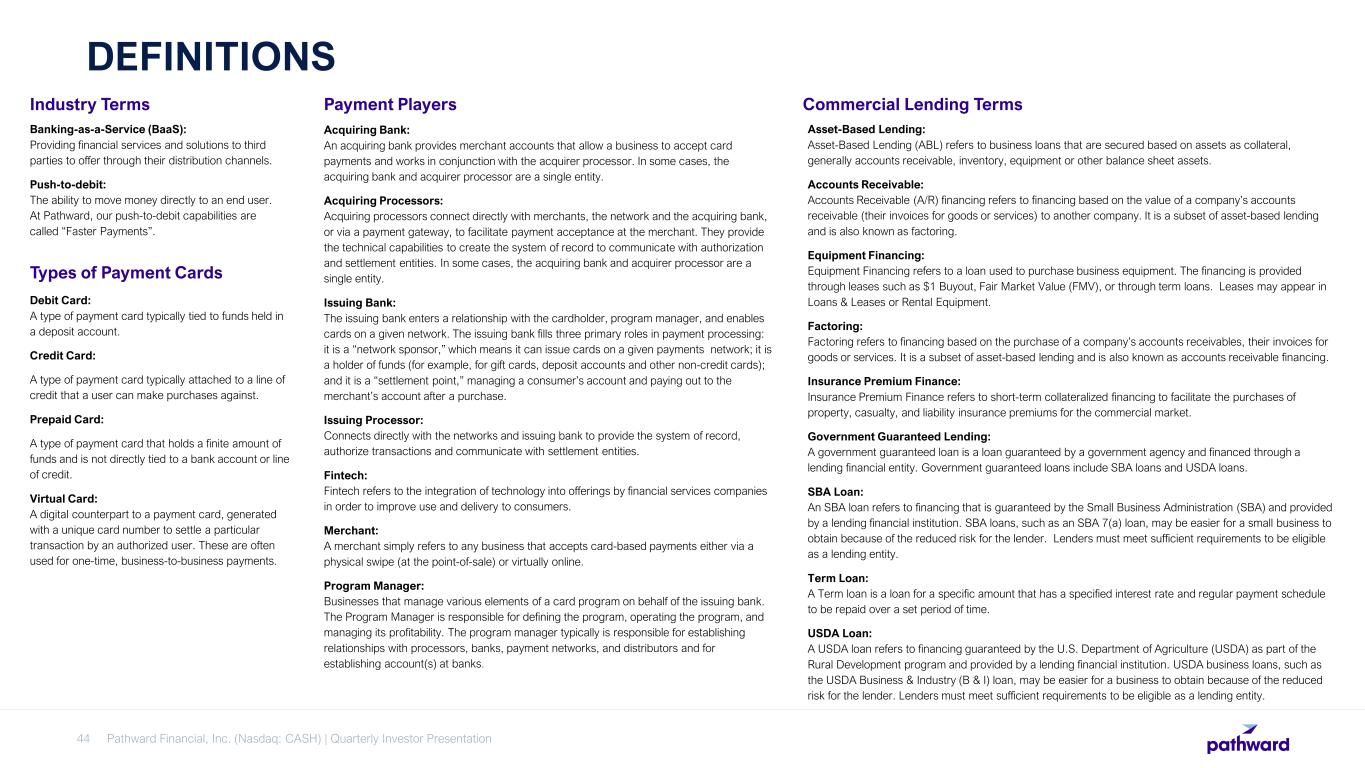 Industry Terms 44 Types of Payment Cards Banking-as-a-Service (BaaS): Providing financial services and solutions to third parties to offer through their distribution channels. Push-to-debit: The ability to move money directly to an end user. At Pathward, our push-to-debit capabilities are called “Faster Payments”. Debit Card: A type of payment card typically tied to funds held in a deposit account. Credit Card: A type of payment card typically attached to a line of credit that a user can make purchases against. Prepaid Card: A type of payment card that holds a finite amount of funds and is not directly tied to a bank account or line of credit. Virtual Card: A digital counterpart to a payment card, generated with a unique card number to settle a particular transaction by an authorized user. These are often used for one-time, business-to-business payments. Payment Players Acquiring Bank: An acquiring bank provides merchant accounts that allow a business to accept card payments and works in conjunction with the acquirer processor. In some cases, the acquiring bank and acquirer processor are a single entity. Acquiring Processors: Acquiring processors connect directly with merchants, the network and the acquiring bank, or via a payment gateway, to facilitate payment acceptance at the merchant. They provide the technical capabilities to create the system of record to communicate with authorization and settlement entities. In some cases, the acquiring bank and acquirer processor are a single entity. Issuing Bank: The issuing bank enters a relationship with the cardholder, program manager, and enables cards on a given network. The issuing bank fills three primary roles in payment processing: it is a “network sponsor,” which means it can issue cards on a given payments network; it is a holder of funds (for example, for gift cards, deposit accounts and other non-credit cards); and it is a “settlement point,” managing a consumer’s account and paying out to the merchant’s account after a purchase. Issuing Processor: Connects directly with the networks and issuing bank to provide the system of record, authorize transactions and communicate with settlement entities. Fintech: Fintech refers to the integration of technology into offerings by financial services companies in order to improve use and delivery to consumers. Merchant: A merchant simply refers to any business that accepts card-based payments either via a physical swipe (at the point-of-sale) or virtually online. Program Manager: Businesses that manage various elements of a card program on behalf of the issuing bank. The Program Manager is responsible for defining the program, operating the program, and managing its profitability. The program manager typically is responsible for establishing relationships with processors, banks, payment networks, and distributors and for establishing account(s) at banks. DEFINITIONS Pathward Financial, Inc. (Nasdaq: CASH) | Quarterly Investor Presentation Commercial Lending Terms Asset-Based Lending: Asset-Based Lending (ABL) refers to business loans that are secured based on assets as collateral, generally accounts receivable, inventory, equipment or other balance sheet assets. Accounts Receivable: Accounts Receivable (A/R) financing refers to financing based on the value of a company’s accounts receivable (their invoices for goods or services) to another company. It is a subset of asset-based lending and is also known as factoring. Equipment Financing: Equipment Financing refers to a loan used to purchase business equipment. The financing is provided through leases such as $1 Buyout, Fair Market Value (FMV), or through term loans. Leases may appear in Loans & Leases or Rental Equipment. Factoring: Factoring refers to financing based on the purchase of a company’s accounts receivables, their invoices for goods or services. It is a subset of asset-based lending and is also known as accounts receivable financing. Insurance Premium Finance: Insurance Premium Finance refers to short-term collateralized financing to facilitate the purchases of property, casualty, and liability insurance premiums for the commercial market. Government Guaranteed Lending: A government guaranteed loan is a loan guaranteed by a government agency and financed through a lending financial entity. Government guaranteed loans include SBA loans and USDA loans. SBA Loan: An SBA loan refers to financing that is guaranteed by the Small Business Administration (SBA) and provided by a lending financial institution. SBA loans, such as an SBA 7(a) loan, may be easier for a small business to obtain because of the reduced risk for the lender. Lenders must meet sufficient requirements to be eligible as a lending entity. Term Loan: A Term loan is a loan for a specific amount that has a specified interest rate and regular payment schedule to be repaid over a set period of time. USDA Loan: A USDA loan refers to financing guaranteed by the U.S. Department of Agriculture (USDA) as part of the Rural Development program and provided by a lending financial institution. USDA business loans, such as the USDA Business & Industry (B & I) loan, may be easier for a business to obtain because of the reduced risk for the lender. Lenders must meet sufficient requirements to be eligible as a lending entity.