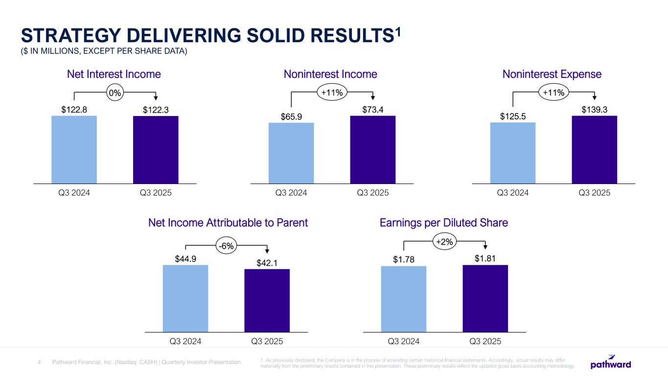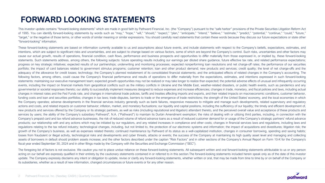 Pathward Financial, Inc. (Nasdaq: CASH) | Quarterly Investor Presentation2 FORWARD LOOKING STATEMENTS This investor update contains “forward-looking statements” which are made in good faith by Pathward Financial, Inc. (the “Company”) pursuant to the “safe harbor” provisions of the Private Securities Litigation Reform Act of 1995. You can identify forward-looking statements by words such as “may,” “hope,” “will,” “should,” “expect,” “plan,” “anticipate,” “intend,” “believe,” “estimate,” “predict,” “potential,” “continue,” “could,” “future,” “target,” or the negative of those terms, or other words of similar meaning or similar expressions. You should carefully read statements that contain these words because they discuss our future expectations or state other “forward-looking” information. These forward-looking statements are based on information currently available to us and assumptions about future events, and include statements with respect to the Company’s beliefs, expectations, estimates, and intentions, which are subject to significant risks and uncertainties, and are subject to change based on various factors, some of which are beyond the Company’s control. Such risks, uncertainties and other factors may cause our actual growth, results of operations, financial condition, cash flows, performance and business prospects and opportunities to differ materially from those expressed in, or implied by, these forward-looking statements. Such statements address, among others, the following subjects: future operating results including our earnings per diluted share guidance, future effective tax rate, and related performance expectations; progress on key strategic initiatives; expected results of our partnerships; underwriting and monitoring processes; expected nonperforming loan resolutions and net charge-off rates; the performance of our securities portfolio; the impact of card balances related to government stimulus programs; customer retention; loan and other product demand; new products and services; credit quality; the level of net charge-offs and the adequacy of the allowance for credit losses; technology; the Company’s planned restatement of its consolidated financial statements; and the anticipated effects of related changes in the Company’s accounting. The following factors, among others, could cause the Company's financial performance and results of operations to differ materially from the expectations, estimates, and intentions expressed in such forward-looking statements: maintaining our executive management team; expected growth opportunities may not be realized or may take longer to realize than expected; the potential adverse effects of unusual and infrequently occurring events, including the impact on financial markets from geopolitical conflicts such as the military conflicts in Ukraine and the Middle East, weather-related disasters, or public health events, such as pandemics and any governmental or societal responses thereto; our ability to successfully implement measures designed to reduce expenses and increase efficiencies; changes in trade, monetary, and fiscal policies and laws, including actual changes in interest rates and the Fed Funds rate, and changes in international trade policies, tariffs and treaties affecting imports and exports, and their related impacts on macroeconomic conditions, customer behavior, funding costs and loan and securities portfolios; changes in tax laws; trade disputes, barriers to trade or the emergence of trade restrictions; the strength of the United States' economy, and the local economies in which the Company operates; adverse developments in the financial services industry generally such as bank failures, responsive measures to mitigate and manage such developments, related supervisory and regulatory actions and costs, and related impacts on customer behavior; inflation, market, and monetary fluctuations; our liquidity and capital positions, including the sufficiency of our liquidity; the timely and efficient development of, new products and services offered by the Company or its strategic partners, as well as risks (including reputational and litigation) attendant thereto, and the perceived overall value and acceptance of these products and services by users; the ability of the Company’s subsidiary Pathward®, N.A. (“Pathward”) to maintain its Durbin Amendment exemption; the risks of dealing with or utilizing third parties, including, in connection with the Company’s prepaid card and tax refund advance businesses, the risk of reduced volume of refund advance loans as a result of reduced customer demand for or usage of the Company’s strategic partners’ refund advance products; our relationship with and any actions which may be initiated by our regulators, and any related increases in compliance and other costs; changes in financial services laws and regulations, including laws and regulations relating to the tax refund industry; technological changes, including, but not limited to, the protection of our electronic systems and information; the impact of acquisitions and divestitures; litigation risk; the growth of the Company’s business, as well as expenses related thereto; continued maintenance by Pathward of its status as a well-capitalized institution, changes in consumer borrowing, spending and saving habits; losses from fraudulent or illegal activity, technological risks and developments and cyber threats, attacks or events; the success of the Company at maintaining its high quality asset level and managing and collecting assets of borrowers in default should problem assets increase; and the other factors described under the caption “Risk Factors” and in other sections of the Company’s Annual Report on Form 10-K for the Company's fiscal year ended September 30, 2024 and in other filings made by the Company with the Securities 