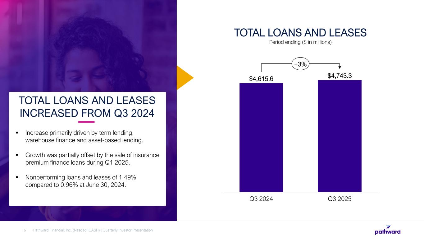  Decrease in deposits at June 30, 2025 when compared to the prior year period was primarily due to a reduction in noninterest bearing and wholesale deposits.  Average Q3 2025 off-balance sheet custodial deposits held in custody at program banks of $732 million compared to $645 million during the prior year period.  $431 million of off-balance sheet custodial deposits as of June 30, 2025, compared to $353 million as of June 30, 2024.  These off-balance sheet custodial deposits earn recordkeeping servicing fee income, typically reflective of the Effective Fed Funds Rate. DEPOSIT BASE SUPPORTS ASSET GROWTH Q3 2024 Q3 2025 $6,431.5 $6,005.2 -7% DEPOSITS 1 Period ending ($ in millions) Pathward Financial, Inc. (Nasdaq: CASH) | Quarterly Investor Presentation5 1 Does not include off-balance sheet custodial deposits