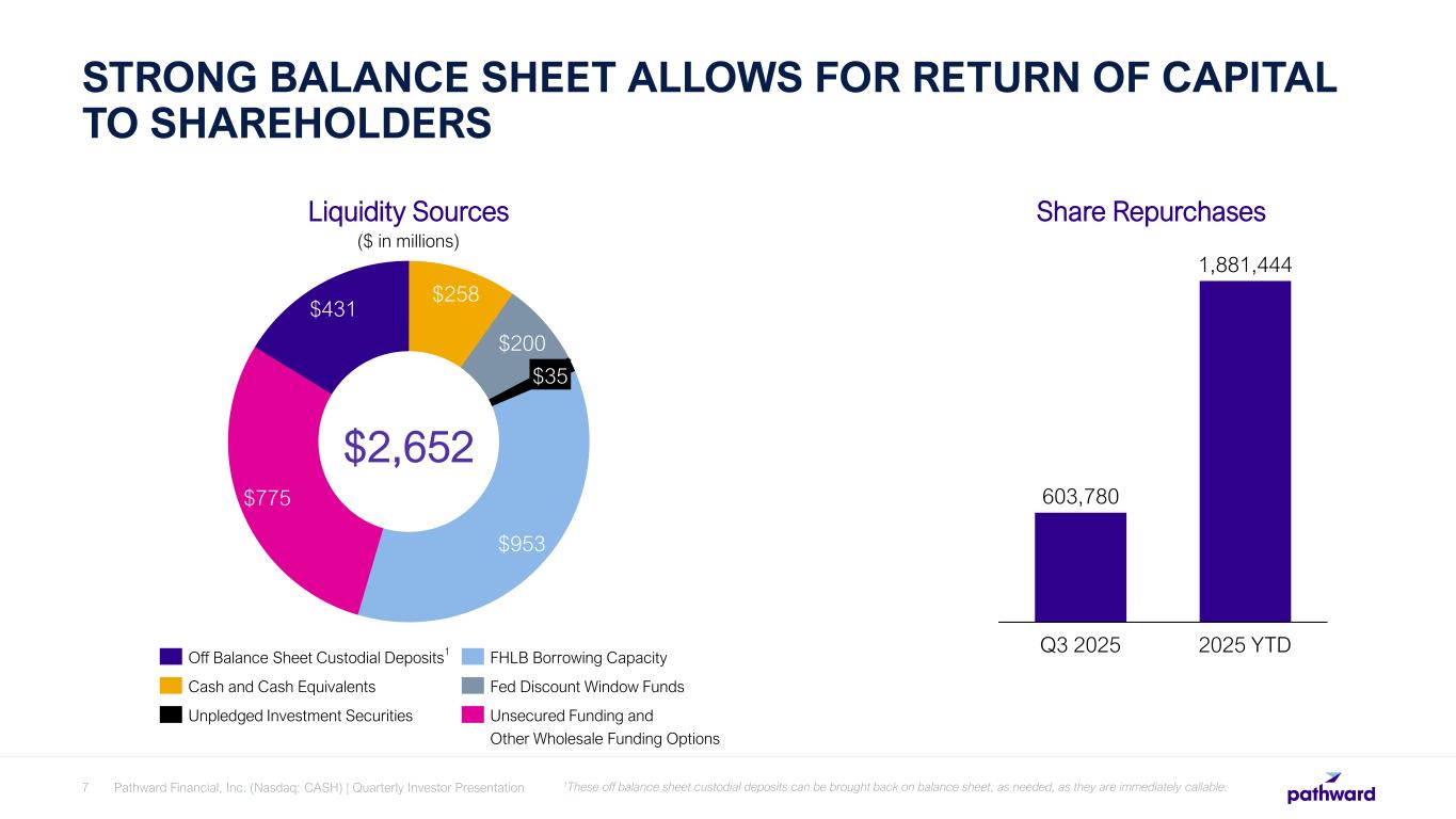TOTAL LOANS AND LEASES INCREASED FROM Q3 2024  Increase primarily driven by term lending, warehouse finance and asset-based lending.  Growth was partially offset by the sale of insurance premium finance loans during Q1 2025.  Nonperforming loans and leases of 1.49% compared to 0.96% at June 30, 2024. Q3 2024 Q3 2025 $4,615.6 $4,743.3 +3% TOTAL LOANS AND LEASES Period ending ($ in millions) Pathward Financial, Inc. (Nasdaq: CASH) | Quarterly Investor Presentation6