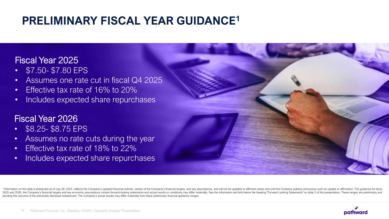 PRELIMINARY FISCAL YEAR GUIDANCE1 Pathward Financial, Inc. (Nasdaq: CASH) | Quarterly Investor Presentation8 Fiscal Year 2025 • $7.50- $7.80 EPS • Assumes one rate cut in fiscal Q4 2025 • Effective tax rate of 16% to 20% • Includes expected share repurchases 1 Information on this slide is presented as of July 28, 2025, reflects the Company’s updated financial outlook, certain of the Company’s financial targets, and key assumptions, and will not be updated or affirmed unless and until the Company publicly announces such an update or affirmation. The guidance for fiscal 2025 and 2026, the Company’s financial targets and key economic assumptions contain forward-looking statements and actual results or conditions may differ materially. See the information set forth below the heading "Forward Looking Statements" on slide 2 of this presentation. These ranges are preliminary and pending the outcome of the previously disclosed restatement. The Company’s actual results may differ materially from these preliminary financial guidance ranges. Fiscal Year 2026 • $8.25- $8.75 EPS • Assumes no rate cuts during the year • Effective tax rate of 18% to 22% • Includes expected share repurchases