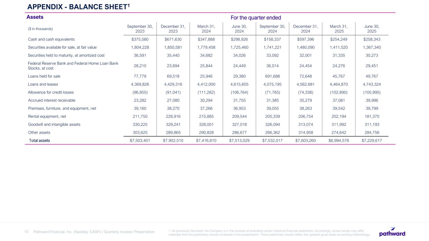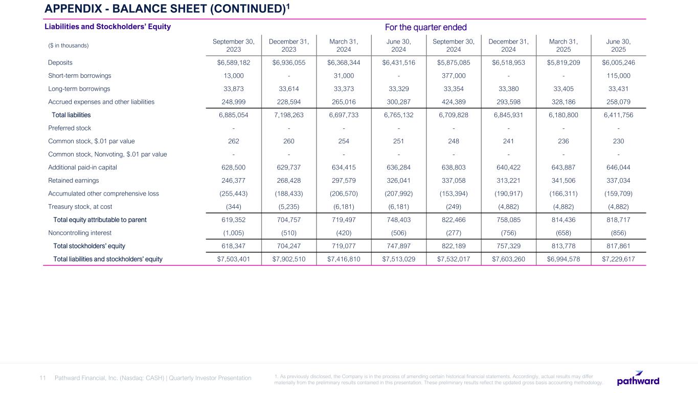 Pathward Financial, Inc. (Nasdaq: CASH) | Quarterly Investor Presentation10 APPENDIX - BALANCE SHEET1 Assets For the quarter ended ($ in thousands) September 30, 2023 December 31, 2023 March 31, 2024 June 30, 2024 September 30, 2024 December 31, 2024 March 31, 2025 June 30, 2025 Cash and cash equivalents $375,580 $671,630 $347,888 $298,926 $158,337 $597,396 $254,249 $258,343 Securities available for sale, at fair value 1,804,228 1,850,581 1,779,458 1,725,460 1,741,221 1,480,090 1,411,520 1,367,340 Securities held to maturity, at amortized cost 36,591 35,440 34,682 34,026 33,092 32,001 31,335 30,273 Federal Reserve Bank and Federal Home Loan Bank Stocks, at cost 28,210 23,694 25,844 24,449 36,014 24,454 24,276 29,451 Loans held for sale 77,779 69,518 25,946 29,380 691,688 72,648 45,767 49,767 Loans and leases 4,369,826 4,429,316 4,412,000 4,615,605 4,075,195 4,562,681 4,464,870 4,743,324 Allowance for credit losses (96,855) (91,041) (111,282) (106,764) (71,765) (74,338) (102,890) (105,995) Accrued interest receivable 23,282 27,080 30,294 31,755 31,385 35,279 37,081 39,996 Premises, furniture, and equipment, net 39,160 38,270 37,266 36,953 39,055 38,263 39,542 39,799 Rental equipment, net 211,750 228,916 215,885 209,544 205,339 206,754 202,194 181,370 Goodwill and intangible assets 330,225 329,241 328,001 327,018 326,094 313,074 311,992 311,193 Other assets 303,625 289,865 290,828 286,677 266,362 314,958 274,642 284,756 Total assets $7,503,401 $7,902,510 $7,416,810 $7,513,029 $7,532,017 $7,603,260 $6,994,578 $7,229,617 1. As previously disclosed, the Company is in the process of amending certain historical financial statements. Accordingly, actual results may differ materially from the preliminary results contained in this presentation. These preliminary results reflect the updated gross basis accounting methodology.
