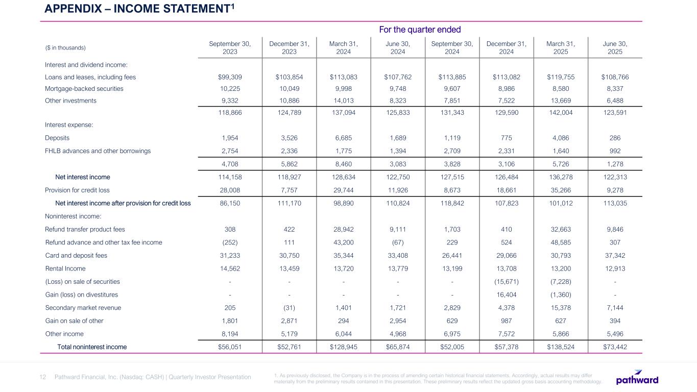 Pathward Financial, Inc. (Nasdaq: CASH) | Quarterly Investor Presentation11 APPENDIX - BALANCE SHEET (CONTINUED)1 Liabilities and Stockholders’ Equity For the quarter ended ($ in thousands) September 30, 2023 December 31, 2023 March 31, 2024 June 30, 2024 September 30, 2024 December 31, 2024 March 31, 2025 June 30, 2025 Deposits $6,589,182 $6,936,055 $6,368,344 $6,431,516 $5,875,085 $6,518,953 $5,819,209 $6,005,246 Short-term borrowings 13,000 - 31,000 - 377,000 - - 115,000 Long-term borrowings 33,873 33,614 33,373 33,329 33,354 33,380 33,405 33,431 Accrued expenses and other liabilities 248,999 228,594 265,016 300,287 424,389 293,598 328,186 258,079 Total liabilities 6,885,054 7,198,263 6,697,733 6,765,132 6,709,828 6,845,931 6,180,800 6,411,756 Preferred stock - - - - - - - - Common stock, $.01 par value 262 260 254 251 248 241 236 230 Common stock, Nonvoting, $.01 par value - - - - - - - - Additional paid-in capital 628,500 629,737 634,415 636,284 638,803 640,422 643,887 646,044 Retained earnings 246,377 268,428 297,579 326,041 337,058 313,221 341,506 337,034 Accumulated other comprehensive loss (255,443) (188,433) (206,570) (207,992) (153,394) (190,917) (166,311) (159,709) Treasury stock, at cost (344) (5,235) (6,181) (6,181) (249) (4,882) (4,882) (4,882) Total equity attributable to parent 619,352 704,757 719,497 748,403 822,466 758,085 814,436 818,717 Noncontrolling interest (1,005) (510) (420) (506) (277) (756) (658) (856) Total stockholders’ equity 618,347 704,247 719,077 747,897 822,189 757,329 813,778 817,861 Total liabilities and stockholders’ equity $7,503,401 $7,902,510 $7,416,810 $7,513,029 $7,532,017 $7,603,260 $6,994,578 $7,229,617 1. As previously disclosed, the Company is in the process of amending certain historical financial statements. Accordingly, actual results may differ materially from the preliminary results contained in this presentation. These preliminary results reflect the updated gross basis accounting methodology.