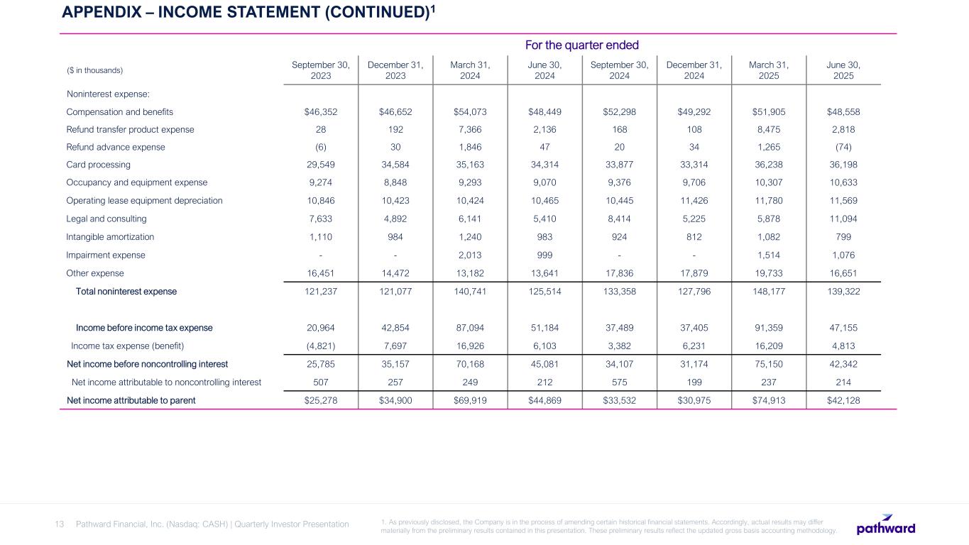 Pathward Financial, Inc. (Nasdaq: CASH) | Quarterly Investor Presentation12 APPENDIX – INCOME STATEMENT1 For the quarter ended ($ in thousands) September 30, 2023 December 31, 2023 March 31, 2024 June 30, 2024 September 30, 2024 December 31, 2024 March 31, 2025 June 30, 2025 Interest and dividend income: Loans and leases, including fees $99,309 $103,854 $113,083 $107,762 $113,885 $113,082 $119,755 $108,766 Mortgage-backed securities 10,225 10,049 9,998 9,748 9,607 8,986 8,580 8,337 Other investments 9,332 10,886 14,013 8,323 7,851 7,522 13,669 6,488 118,866 124,789 137,094 125,833 131,343 129,590 142,004 123,591 Interest expense: Deposits 1,954 3,526 6,685 1,689 1,119 775 4,086 286 FHLB advances and other borrowings 2,754 2,336 1,775 1,394 2,709 2,331 1,640 992 4,708 5,862 8,460 3,083 3,828 3,106 5,726 1,278 Net interest income 114,158 118,927 128,634 122,750 127,515 126,484 136,278 122,313 Provision for credit loss 28,008 7,757 29,744 11,926 8,673 18,661 35,266 9,278 Net interest income after provision for credit loss 86,150 111,170 98,890 110,824 118,842 107,823 101,012 113,035 Noninterest income: Refund transfer product fees 308 422 28,942 9,111 1,703 410 32,663 9,846 Refund advance and other tax fee income (252) 111 43,200 (67) 229 524 48,585 307 Card and deposit fees 31,233 30,750 35,344 33,408 26,441 29,066 30,793 37,342 Rental Income 14,562 13,459 13,720 13,779 13,199 13,708 13,200 12,913 (Loss) on sale of securities - - - - - (15,671) (7,228) - Gain (loss) on divestitures - - - - - 16,404 (1,360) - Secondary market revenue 205 (31) 1,401 1,721 2,829 4,378 15,378 7,144 Gain on sale of other 1,801 2,871 294 2,954 629 987 627 394 Other income 8,194 5,179 6,044 4,968 6,975 7,572 5,866 5,496 Total noninterest income $56,051 $52,761 $128,945 $65,874 $52,005 $57,378 $138,524 $73,442 1. As previously disclosed, the Company is in the process of amending certain historical financial statements. Accordingly, actual results may differ materially from the preliminary results contained in this presentation. These preliminary results reflect the updated gross basis accounting methodology.