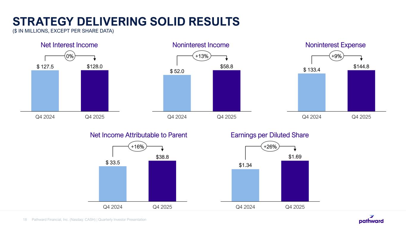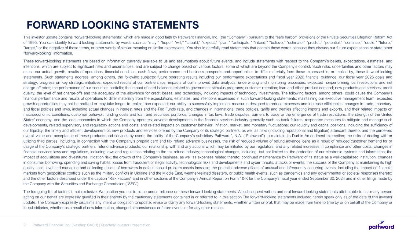 Pathward Financial, Inc. (Nasdaq: CASH) | Quarterly Investor Presentation2 FORWARD LOOKING STATEMENTS This investor update contains “forward-looking statements” which are made in good faith by Pathward Financial, Inc. (the “Company”) pursuant to the “safe harbor” provisions of the Private Securities Litigation Reform Act of 1995. You can identify forward-looking statements by words such as “may,” “hope,” “will,” “should,” “expect,” “plan,” “anticipate,” “intend,” “believe,” “estimate,” “predict,” “potential,” “continue,” “could,” “future,” “target,” or the negative of those terms, or other words of similar meaning or similar expressions. You should carefully read statements that contain these words because they discuss our future expectations or state other “forward-looking” information. These forward-looking statements are based on information currently available to us and assumptions about future events, and include statements with respect to the Company’s beliefs, expectations, estimates, and intentions, which are subject to significant risks and uncertainties, and are subject to change based on various factors, some of which are beyond the Company’s control. Such risks, uncertainties and other factors may cause our actual growth, results of operations, financial condition, cash flows, performance and business prospects and opportunities to differ materially from those expressed in, or implied by, these forward-looking statements. Such statements address, among others, the following subjects: future operating results including our performance expectations and fiscal year 2026 financial guidance; our fiscal year 2026 goals and strategy; progress on key strategic initiatives; expected results of our partnerships; impacts of our improved data analytics, underwriting and monitoring processes; expected nonperforming loan resolutions and net charge-off rates; the performance of our securities portfolio; the impact of card balances related to government stimulus programs; customer retention; loan and other product demand; new products and services; credit quality; the level of net charge-offs and the adequacy of the allowance for credit losses; and technology, including impacts of technology investments. The following factors, among others, could cause the Company's financial performance and results of operations to differ materially from the expectations, estimates, and intentions expressed in such forward-looking statements: maintaining our executive management team; expected growth opportunities may not be realized or may take longer to realize than expected; our ability to successfully implement measures designed to reduce expenses and increase efficiencies; changes in trade, monetary, and fiscal policies and laws, including actual changes in interest rates and the Fed Funds rate, and changes in international trade policies, tariffs and treaties affecting imports and exports, and their related impacts on macroeconomic conditions, customer behavior, funding costs and loan and securities portfolios; changes in tax laws; trade disputes, barriers to trade or the emergence of trade restrictions; the strength of the United States' economy, and the local economies in which the Company operates; adverse developments in the financial services industry generally such as bank failures, responsive measures to mitigate and manage such developments, related supervisory and regulatory actions and costs, and related impacts on customer behavior; inflation, market, and monetary fluctuations; our liquidity and capital positions, including the sufficiency of our liquidity; the timely and efficient development of, new products and services offered by the Company or its strategic partners, as well as risks (including reputational and litigation) attendant thereto, and the perceived overall value and acceptance of these products and services by users; the ability of the Company’s subsidiary Pathward®, N.A. (“Pathward”) to maintain its Durbin Amendment exemption; the risks of dealing with or utilizing third parties, including, in connection with the Company’s prepaid card and tax refund advance businesses, the risk of reduced volume of refund advance loans as a result of reduced customer demand for or usage of the Company’s strategic partners’ refund advance products; our relationship with and any actions which may be initiated by our regulators, and any related increases in compliance and other costs; changes in financial services laws and regulations, including laws and regulations relating to the tax refund industry; technological changes, including, but not limited to, the protection of our electronic systems and information; the impact of acquisitions and divestitures; litigation risk; the growth of the Company’s business, as well as expenses related thereto; continued maintenance by Pathward of its status as a well-capitalized institution, changes in consumer borrowing, spending and saving habits; losses from fraudulent or illegal activity, technological risks and developments and cyber threats, attacks or events; the success of the Company at maintaining its high quality asset level and managing and collecting assets of borrowers in default should problem assets increase; the potential adverse effects of unusual and infrequently occurring events, including the impact on financial markets from geopolitical conflicts such as the military conflicts in Ukraine and the Middle East, weather-related disasters, or public health events, such as pandemics and any governmental or societal responses thereto; and the other factors described under the caption “Risk Factors” and in other sections of the Company’s Annual Report on Form 10-K for the Company's fiscal year ended September 30, 2024 and in other filings made by the Company with the Securities and Exchange Commission (“SEC”). The foregoing list of fac