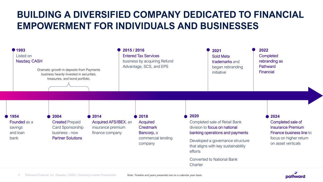 Since our founding, we have worked to advance financial inclusion. We seek out diverse partners, including fintechs, affinity groups, government agencies, and other banks and work with them to identify markets where people and businesses are underserved. Our national bank charter, coordination with regulators, and deep understanding of risk mitigation and compliance allow us to guide our partners and deliver financial products, services and funding to the people and businesses who need them the most. We are powering financial inclusion. AT PATHWARD®, LEADING THE WAY TO FINANCIAL ACCESS IS THE HEART OF OUR BUSINESS. 3 Pathward Financial, Inc. (Nasdaq: CASH) | Quarterly Investor Presentation