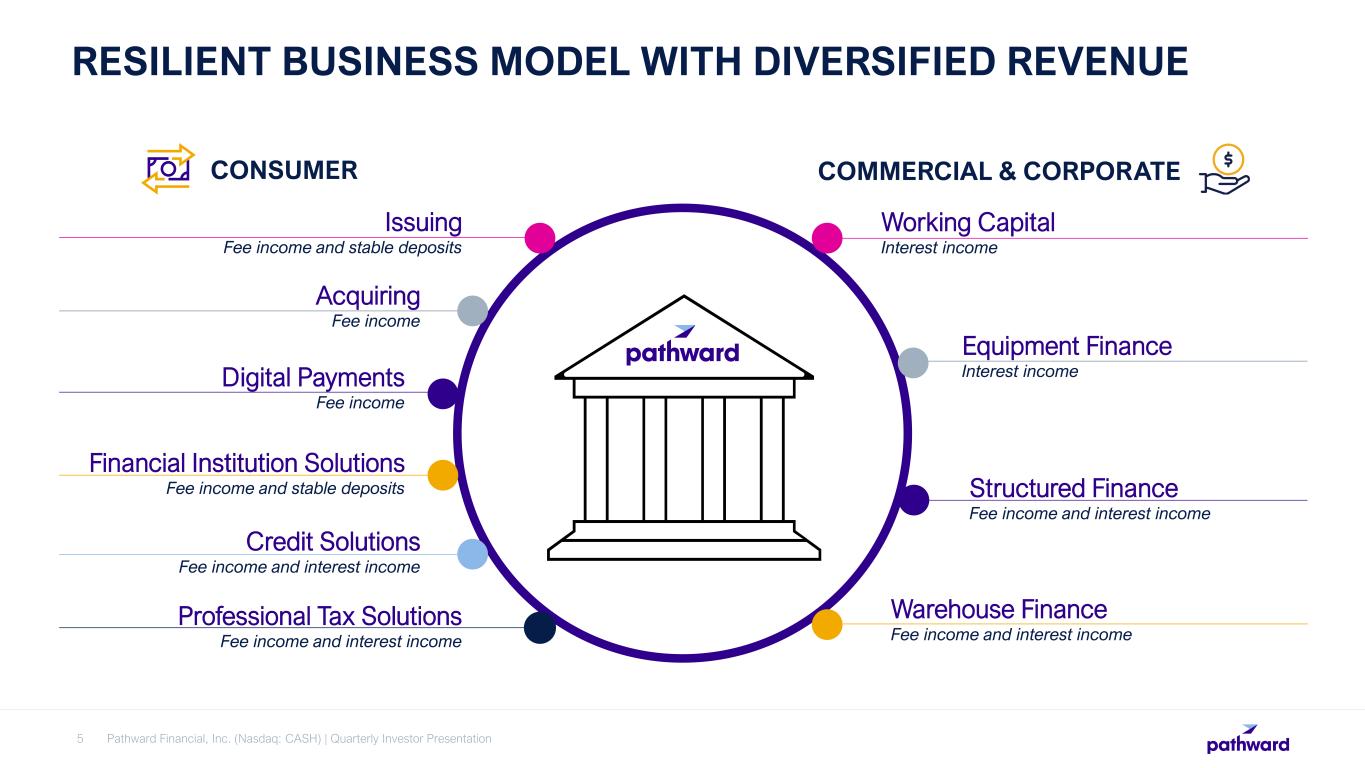 BUILDING A DIVERSIFIED COMPANY DEDICATED TO FINANCIAL EMPOWERMENT FOR INDIVIDUALS AND BUSINESSES 1993 Listed on Nasdaq: CASH 2015 / 2016 Entered Tax Services business by acquiring Refund Advantage, SCS, and EPS 2020 Completed sale of Retail Bank division to focus on national banking operations and payments Developed a governance structure that aligns with key sustainability efforts Converted to National Bank Charter 2004 Created Prepaid Card Sponsorship business - now Partner Solutions 2014 Acquired AFS/IBEX, an insurance premium finance company 2018 Acquired Crestmark Bancorp, a commercial lending company Dramatic growth in deposits from Payments business heavily invested in securities, treasuries, and bond portfolio. 1954 Founded as a savings and loan bank 2021 Sold Meta trademarks and began rebranding initiative 2022 Completed rebranding as Pathward Financial 4 Pathward Financial, Inc. (Nasdaq: CASH) | Quarterly Investor Presentation 2024 Completed sale of Insurance Premium Finance business line to focus on higher return on asset verticals Note: Timeline and years presented are on a calendar year basis.