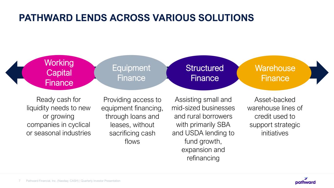 PARTNER SOLUTIONS COLLABORATES WITH PARTNERS TO INNOVATE 6 Pathward Financial, Inc. (Nasdaq: CASH) | Quarterly Investor Presentation Issuing Acquiring Digital Payments Financial Institution Solutions Credit Solutions Professional Tax Solutions A leading debit and prepaid card issuer sponsoring partner programs Enable partners’ lending solutions to serve diverse credit needs Partner with a network of tax preparers offering a variety of products Partner with financial institutions to offer additional financial services Enable partners to move money quickly, efficiently and at a large scale across multiple payment rails Accepting and processing merchant payments with our partners