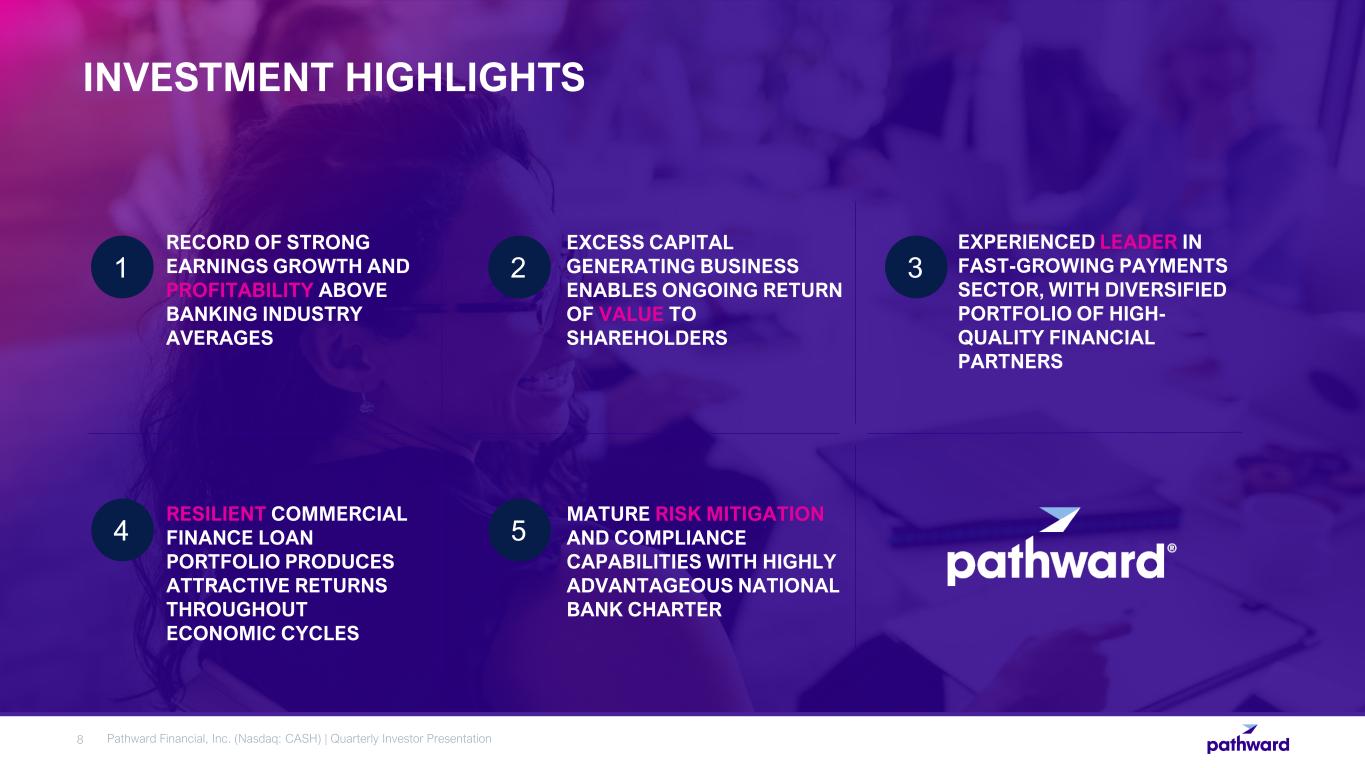 PATHWARD LENDS ACROSS VARIOUS SOLUTIONS Pathward Financial, Inc. (Nasdaq: CASH) | Quarterly Investor Presentation7 Working Capital Finance Equipment Finance Structured Finance Ready cash for liquidity needs to new or growing companies in cyclical or seasonal industries Providing access to equipment financing, through loans and leases, without sacrificing cash flows Assisting small and mid-sized businesses and rural borrowers with primarily SBA and USDA lending to fund growth, expansion and refinancing Warehouse Finance Asset-backed warehouse lines of credit used to support strategic initiatives
