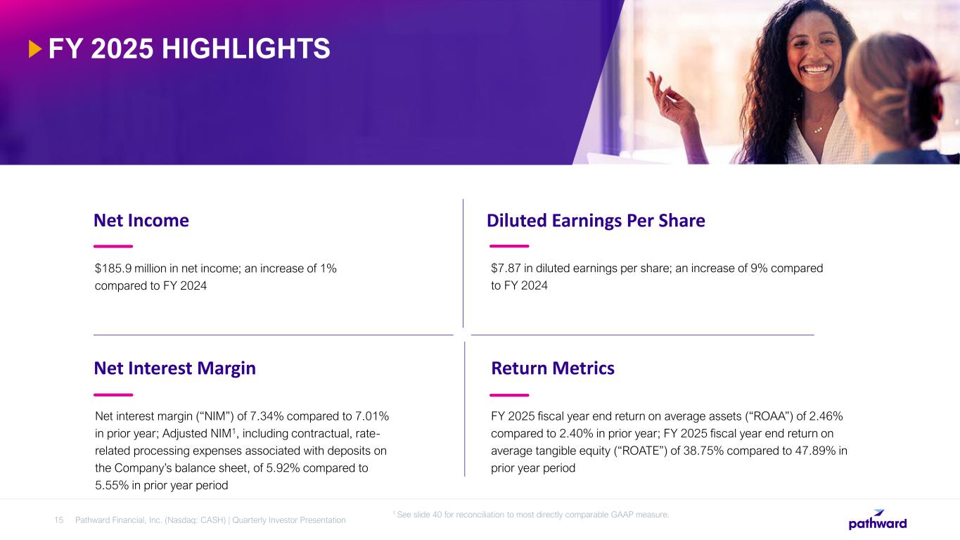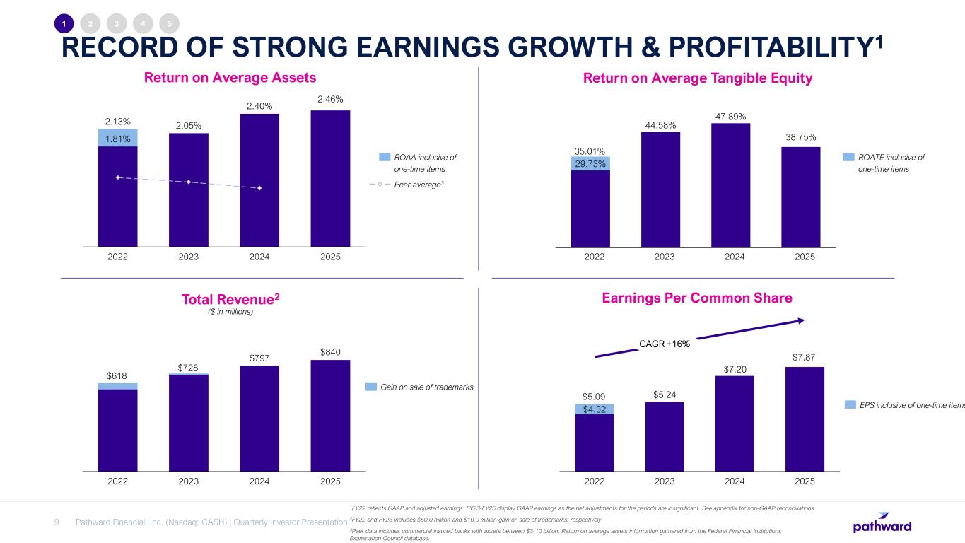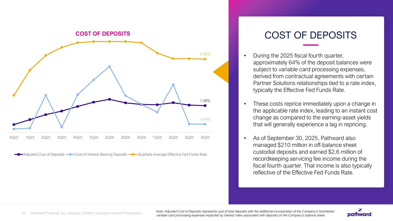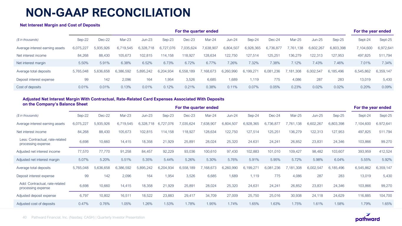 Pathward Financial, Inc. (Nasdaq: CASH) | Quarterly Investor Presentation40 NON-GAAP RECONCILIATION For the quarter ended For the year ended ($ in thousands) Sep-22 Dec-22 Mar-23 Jun-23 Sep-23 Dec-23 Mar-24 Jun-24 Sep-24 Dec-24 Mar-25 Jun-25 Sep-25 Sept-24 Sept-25 Average interest earning assets 6,075,227 5,935,926 6,719,545 6,328,718 6,727,076 7,035,624 7,638,907 6,804,507 6,928,365 6,736,877 7,761,138 6,602,267 6,803,398 7,104,600 6,972,641 Net interest income 84,268 88,430 105,673 102,815 114,158 118,927 128,634 122,750 127,514 125,251 136,279 122,313 127,953 497,825 511,794 Net interest margin 5.50% 5.91% 6.38% 6.52% 6.73% 6.72% 6.77% 7.26% 7.32% 7.38% 7.12% 7.43% 7.46% 7.01% 7.34% Average total deposits 5,765,048 5,636,658 6,386,592 5,895,242 6,204,934 6,558,189 7,168,673 6,260,990 6,199,271 6,081,236 7,181,308 6,002,547 6,185,496 6,545,862 6,359,147 Deposit interest expense 99 142 2,096 164 1,954 3,526 6,685 1,689 1,119 775 4,086 287 283 13,019 5,430 Cost of deposits 0.01% 0.01% 0.13% 0.01% 0.12% 0.21% 0.38% 0.11% 0.07% 0.05% 0.23% 0.02% 0.02% 0.20% 0.09% Net Interest Margin and Cost of Deposits Adjusted Net Interest Margin With Contractual, Rate-Related Card Expenses Associated With Deposits on the Company’s Balance Sheet For the quarter ended For the year ended ($ in thousands) Sep-22 Dec-22 Mar-23 Jun-23 Sep-23 Dec-23 Mar-24 Jun-24 Sep-24 Dec-24 Mar-25 Jun-25 Sep-25 Sept-24 Sept-25 Average interest earning assets 6,075,227 5,935,926 6,719,545 6,328,718 6,727,076 7,035,624 7,638,907 6,804,507 6,928,365 6,736,877 7,761,138 6,602,267 6,803,398 7,104,600 6.972,641 Net interest income 84,268 88,430 105,673 102,815 114,158 118,927 128,634 122,750 127,514 125,251 136,279 122,313 127,953 497,825 511.794 Less: Contractual, rate-related processing expense 6,698 10,660 14,415 18,358 21,929 25,891 28,024 25,320 24.631 24,241 26,852 23,831 24,346 103,866 99.270 Adjusted net interest income 77,570 77,770 91,258 84,457 92,229 93,036 100,610 97,430 102,883 101,010 109,427 98,482 103,607 393,959 412,524 Adjusted net interest margin 5.07% 5.20% 5.51% 5.35% 5.44% 5.26% 5.30% 5.76% 5.91% 5.95% 5.72% 5.98% 6.04% 5.55% 5.92% Average total deposits 5,765,048 5,636,658 6,386,592 5,895,242 6,204,934 6,558,189 7,168,673 6,260,990 6,199,271 6,081,236 7,181,308 6,002,547 6,185,496 6,545,862 6,359,147 Deposit interest expense 99 142 2,096 164 1,954 3,526 6,685 1,689 1,119 775 4,086 287 283 13,019 5,430 Add: Contractual, rate-related processing expense 6,698 10,660 14,415 18,358 21,929 25,891 28,024 25,320 24,631 24,241 26,852 23,831 24,346 103,866 99,270 Adjusted deposit expense 6,797 10,802 16,511 18,522 23,883 29,417 34,709 27,009 25,750 25,016 30,938 24,118 24,629 116,885 104,700 Adjusted cost of deposits 0.47% 0.76% 1.05% 1.26% 1.53% 1.78% 1.95% 1.74% 1.65% 1.63% 1.75% 1.61% 1.58% 1.79% 1.65%