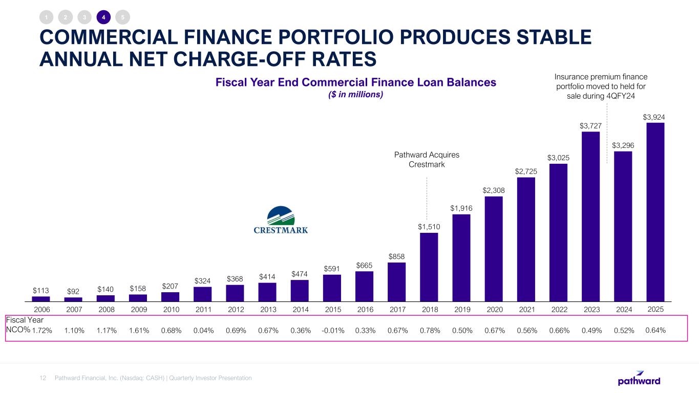 COMMERCIAL FINANCE PORTFOLIO PRODUCES STABLE ANNUAL NET CHARGE-OFF RATES 12 Fiscal Year End Commercial Finance Loan Balances ($ in millions) $113 $92 $140 $158 $207 $324 $368 $414 $474 $591 $665 $858 $1,510 $1,916 $2,308 $2,725 $3,025 $3,727 $3,296 $3,924 0 500 1,000 1,500 2,000 2,500 3,000 3,500 4,000 2006 1.72% 2007 1.10% 2008 1.17% 2009 1.61% 2010 0.68% 2011 0.04% 2012 0.69% 2013 0.67% 2014 0.36% 2015 -0.01% 2016 0.33% 2017 0.67% 2018 0.78% 2019 0.50% 2020 0.67% 2021 0.56% 2022 0.66% 2023 0.49% 2024 0.52% Fiscal Year NCO% 1 2 3 4 5 Pathward Acquires Crestmark Pathward Financial, Inc. (Nasdaq: CASH) | Quarterly Investor Presentation Insurance premium finance portfolio moved to held for sale during 4QFY24 2025 0.64%