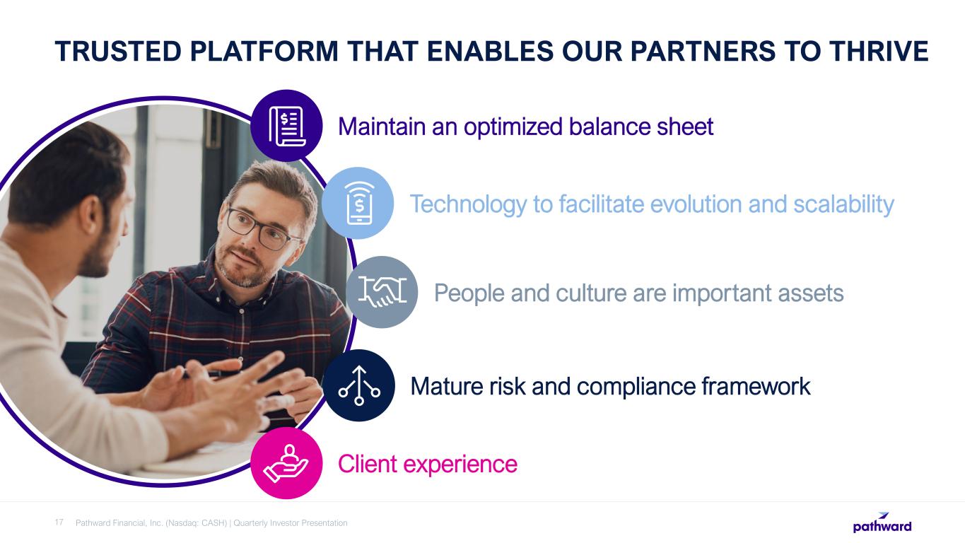 TRUSTED PLATFORM THAT ENABLES OUR PARTNERS TO THRIVE 16 Optimized balance sheet with optimized asset mix Technology to facilitate evolution and scalability People and culture are important assets Mature risk and compliance framework Pathward Financial, Inc. (Nasdaq: CASH) | Quarterly Investor Presentation