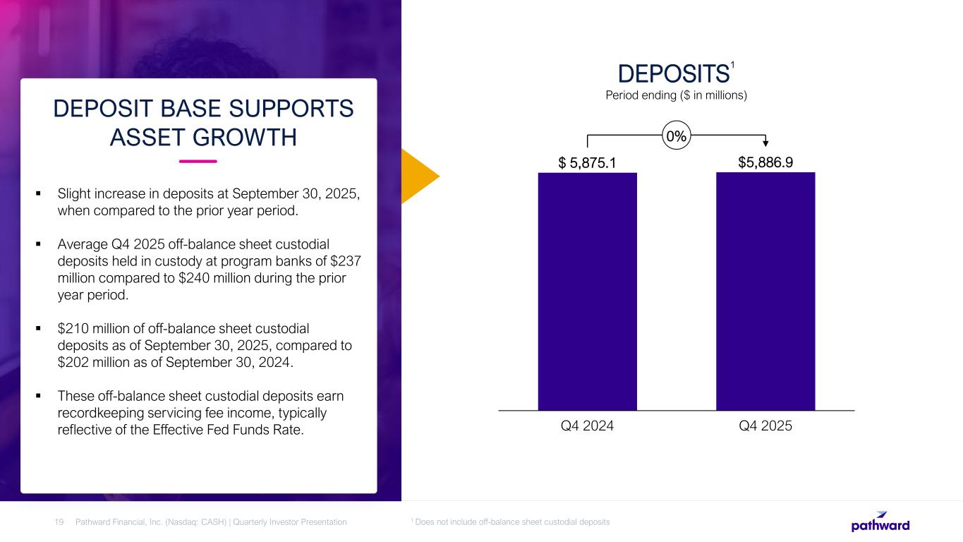  Slight increase in deposits at September 30, 2025, when compared to the prior year period.  Average Q4 2025 off-balance sheet custodial deposits held in custody at program banks of $237 million compared to $240 million during the prior year period.  $210 million of off-balance sheet custodial deposits as of September 30, 2025, compared to $202 million as of September 30, 2024.  These off-balance sheet custodial deposits earn recordkeeping servicing fee income, typically reflective of the Effective Fed Funds Rate. DEPOSIT BASE SUPPORTS ASSET GROWTH Q4 2024 Q4 2025 $ 5,875.1 $5,886.9 0% DEPOSITS 1 Period ending ($ in millions) Pathward Financial, Inc. (Nasdaq: CASH) | Quarterly Investor Presentation19 1 Does not include off-balance sheet custodial deposits