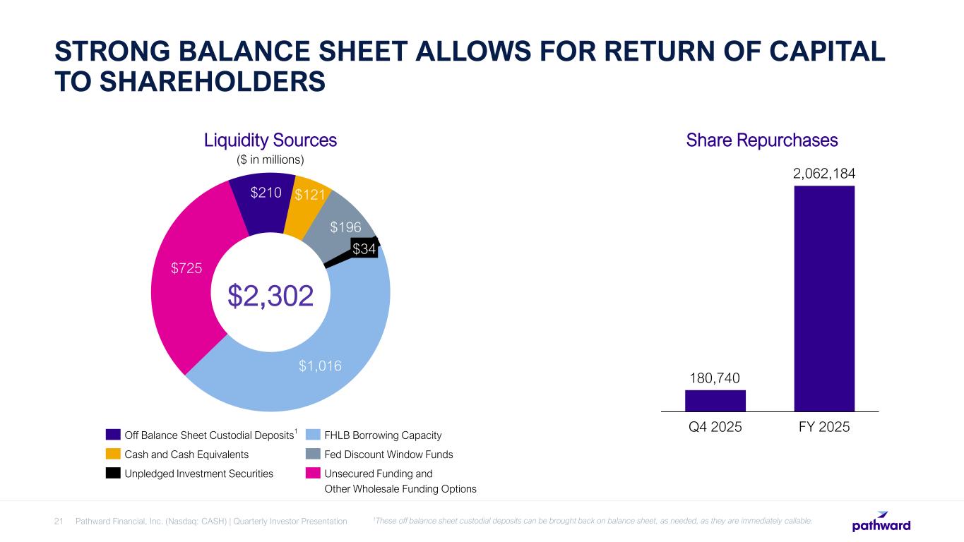 Pathward Financial, Inc. (Nasdaq: CASH) | Quarterly Investor Presentation35 CAPITAL AND SOURCES OF LIQUIDITY Regulatory Capital as of September 30, 2025 At September 30, 2025¹ Pathward Financial, Inc. Pathward, N.A. Tier 1 Leverage 9.79% 10.00% Common Equity Tier 1 12.70% 13.23% Tier 1 Capital 12.95% 13.23% Total Capital 14.27% 14.19% Primary & Secondary Liquidity Sources ($ in millions) Cash and Cash Equivalents $121 Unpledged Investment Securities $34 FHLB Borrowing Capacity $1,016 Funds Available through Fed Discount Window $196 Unsecured Funding Providers $725 Deposit Balances Held at Other Banks $210 Total Liquidity $2,302 9.05% 8.90% 8.32% 9.78% 9.79% 9.22% 9.16% 8.52% 10.00% 10.00% 4Q24 1Q25 2Q25 3Q25 4Q25 Tier 1 Leverage Ratio 14.14% 14.04% 15.57% 14.76% 14.27%14.03% 14.03% 15.51% 14.68% 14.19% 4Q24 1Q25 2Q25 3Q25 4Q25 Total Capital Ratio Pathward Financial, Inc. Pathward, N.A. Minimum Requirement to be Well-Capitalized under Prompt Corrective Action Provisions 1. Regulatory capital reflects the Company's election of the five-year CECL transition for regulatory capital purposes. Amounts are preliminary pending completion and filing of the Company's regulatory reports.