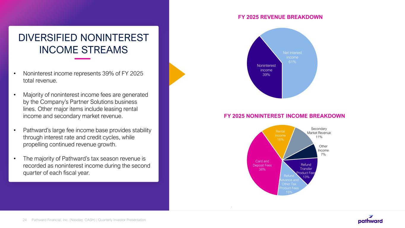 • Noninterest income represents 39% of FY 2025 total revenue. • Majority of noninterest income fees are generated by the Company’s Partner Solutions business lines. Other major items include leasing rental income and secondary market revenue. • Pathward’s large fee income base provides stability through interest rate and credit cycles, while propelling continued revenue growth. • The majority of Pathward’s tax season revenue is recorded as noninterest income during the second quarter of each fiscal year. DIVERSIFIED NONINTEREST INCOME STREAMS Pathward Financial, Inc. (Nasdaq: CASH) | Quarterly Investor Presentation24 Refund Transfer Product Fees 13%Refund Advance and Other Tax Product Fees 15% Card and Deposit Fees 38% Rental Income 16% Secondary Market Revenue 11% Other Income 7% FY 2025 NONINTEREST INCOME BREAKDOWN . Noninterest income 39% Net interest income 61% FY 2025 REVENUE BREAKDOWN