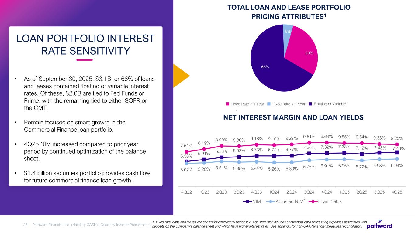 • During the 2025 fiscal fourth quarter, approximately 64% of the deposit balances were subject to variable card processing expenses, derived from contractual agreements with certain Partner Solutions relationships tied to a rate index, typically the Effective Fed Funds Rate. • These costs reprice immediately upon a change in the applicable rate index, leading to an instant cost change as compared to the earning-asset yields that will generally experience a lag in repricing. • As of September 30, 2025, Pathward also managed $210 million in off-balance sheet custodial deposits and earned $2.6 million of recordkeeping servicing fee income during the fiscal fourth quarter. That income is also typically reflective of the Effective Fed Funds Rate. COST OF DEPOSITS Pathward Financial, Inc. (Nasdaq: CASH) | Quarterly Investor Presentation25 COST OF DEPOSITS 1.58% 0.49% 4.30% 4Q22 1Q23 2Q23 3Q23 4Q23 1Q24 2Q24 3Q24 4Q24 1Q25 2Q25 3Q25 4Q25 Adjusted Cost of Deposits Cost of Interest Bearing Deposits Quarterly Average Effective Fed Funds Rate Note: Adjusted Cost of Deposits represents cost of total deposits with the additional incorporation of the Company’s noninterest variable card processing expenses impacted by interest rates associated with deposits on the Company’s balance sheet.