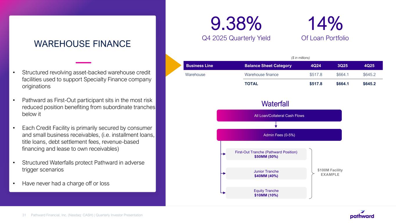 • Consumer credit programs with marketplace lenders offer Pathward a risk adjusted return • Protected by certain layers of credit support and balance sheet flexibility • Programs are offered to strategic partners with payments distribution potential • Agreements typically provide for “excess spread” build-up and protection through a priority of payment within a waterfall CONSUMER FINANCE Pathward Financial, Inc. (Nasdaq: CASH) | Quarterly Investor Presentation30 26.27% Q4 2025 Quarterly Yield 3% Of Loan Portfolio ($ in millions) Business Line Balance Sheet Category 4Q24 3Q25 4Q25 Consumer Consumer finance $248.8 $226.4 $93.3 TOTAL $248.8 $226.4 $93.3 Consumer Payments - Principal, Interest, Fees Collection Account Servicing Principal Losses to Pathward Principal Repayment to Pathward Pathward’s agreed upon interest return Remaining excess spread to Pathward-owned escrow reserve Reserve release to partner is conditional (subordinate) based on product performance Waterfall