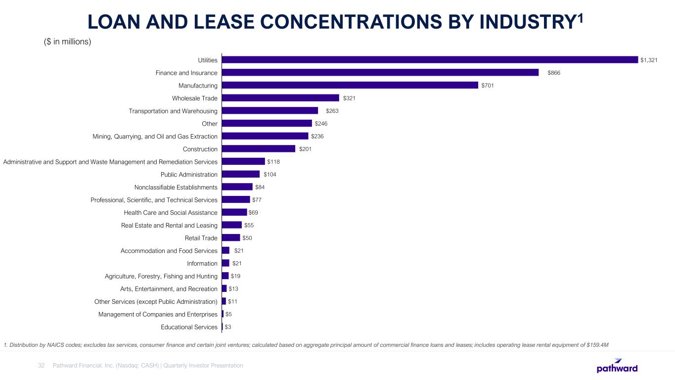 Pathward Financial, Inc. (Nasdaq: CASH) | Quarterly Investor Presentation32 LOAN AND LEASE CONCENTRATIONS BY INDUSTRY1 1. Distribution by NAICS codes; excludes tax services, consumer finance and certain joint ventures; calculated based on aggregate principal amount of commercial finance loans and leases; includes operating lease rental equipment of $159.4M $1,321 $866 $701 $321 $263 $246 $236 $201 $118 $104 $84 $77 $69 $55 $50 $21 $21 $19 $13 $11 $5 $3 Utilities Finance and Insurance Manufacturing Wholesale Trade Transportation and Warehousing Other Mining, Quarrying, and Oil and Gas Extraction Construction Administrative and Support and Waste Management and Remediation Services Public Administration Nonclassifiable Establishments Professional, Scientific, and Technical Services Health Care and Social Assistance Real Estate and Rental and Leasing Retail Trade Accommodation and Food Services Information Agriculture, Forestry, Fishing and Hunting Arts, Entertainment, and Recreation Other Services (except Public Administration) Management of Companies and Enterprises Educational Services ($ in millions)