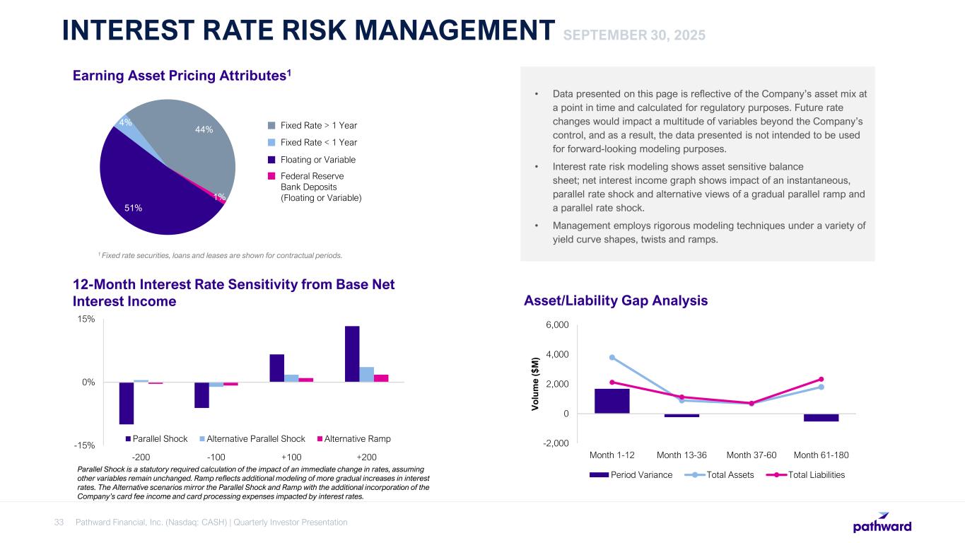 Pathward Financial, Inc. (Nasdaq: CASH) | Quarterly Investor Presentation33 INTEREST RATE RISK MANAGEMENT SEPTEMBER 30, 2025 Asset/Liability Gap Analysis 1 Fixed rate securities, loans and leases are shown for contractual periods. 1% 51% 4% 44% Fixed Rate > 1 Year Earning Asset Pricing Attributes1 Fixed Rate < 1 Year Floating or Variable Federal Reserve Bank Deposits (Floating or Variable) • Data presented on this page is reflective of the Company’s asset mix at a point in time and calculated for regulatory purposes. Future rate changes would impact a multitude of variables beyond the Company’s control, and as a result, the data presented is not intended to be used for forward-looking modeling purposes. • Interest rate risk modeling shows asset sensitive balance sheet; net interest income graph shows impact of an instantaneous, parallel rate shock and alternative views of a gradual parallel ramp and a parallel rate shock. • Management employs rigorous modeling techniques under a variety of yield curve shapes, twists and ramps. -15% 0% 15% -200 -100 +100 +200 Parallel Shock Alternative Parallel Shock Alternative Ramp 12-Month Interest Rate Sensitivity from Base Net Interest Income Parallel Shock is a statutory required calculation of the impact of an immediate change in rates, assuming other variables remain unchanged. Ramp reflects additional modeling of more gradual increases in interest rates. The Alternative scenarios mirror the Parallel Shock and Ramp with the additional incorporation of the Company’s card fee income and card processing expenses impacted by interest rates. -2,000 0 2,000 4,000 6,000 Month 1-12 Month 13-36 Month 37-60 Month 61-180 V o lu m e ($ M ) Period Variance Total Assets Total Liabilities