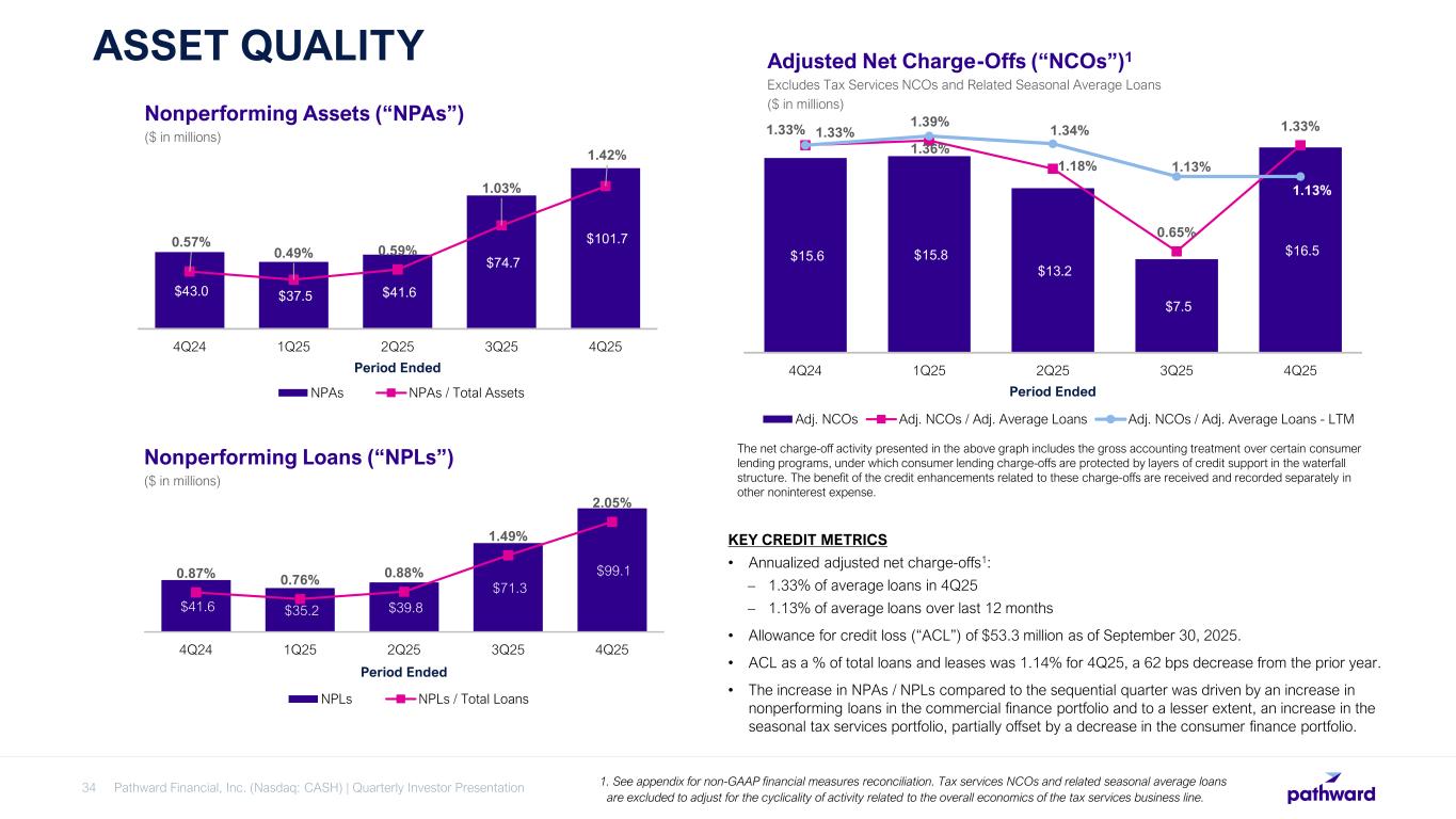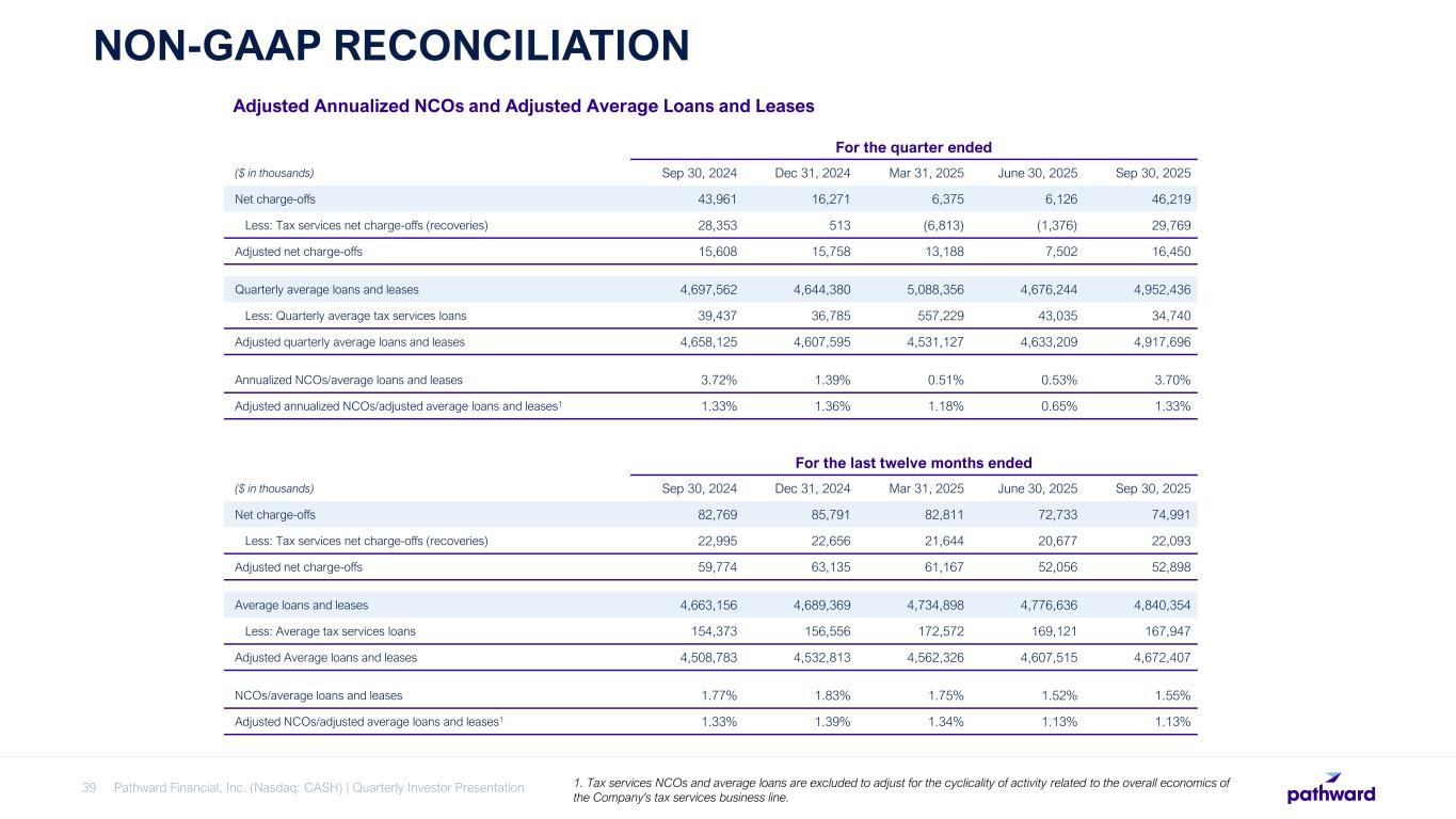 Pathward Financial, Inc. (Nasdaq: CASH) | Quarterly Investor Presentation39 NON-GAAP RECONCILIATION 1. Tax services NCOs and average loans are excluded to adjust for the cyclicality of activity related to the overall economics of the Company's tax services business line. For the quarter ended ($ in thousands) Sep 30, 2024 Dec 31, 2024 Mar 31, 2025 June 30, 2025 Sep 30, 2025 Net charge-offs 43,961 16,271 6,375 6,126 46,219 Less: Tax services net charge-offs (recoveries) 28,353 513 (6,813) (1,376) 29,769 Adjusted net charge-offs 15,608 15,758 13,188 7,502 16,450 Quarterly average loans and leases 4,697,562 4,644,380 5,088,356 4,676,244 4,952,436 Less: Quarterly average tax services loans 39,437 36,785 557,229 43,035 34,740 Adjusted quarterly average loans and leases 4,658,125 4,607,595 4,531,127 4,633,209 4,917,696 Annualized NCOs/average loans and leases 3.72% 1.39% 0.51% 0.53% 3.70% Adjusted annualized NCOs/adjusted average loans and leases1 1.33% 1.36% 1.18% 0.65% 1.33% Adjusted Annualized NCOs and Adjusted Average Loans and Leases For the last twelve months ended ($ in thousands) Sep 30, 2024 Dec 31, 2024 Mar 31, 2025 June 30, 2025 Sep 30, 2025 Net charge-offs 82,769 85,791 82,811 72,733 74,991 Less: Tax services net charge-offs (recoveries) 22,995 22,656 21,644 20,677 22,093 Adjusted net charge-offs 59,774 63,135 61,167 52,056 52,898 Average loans and leases 4,663,156 4,689,369 4,734,898 4,776,636 4,840,354 Less: Average tax services loans 154,373 156,556 172,572 169,121 167,947 Adjusted Average loans and leases 4,508,783 4,532,813 4,562,326 4,607,515 4,672,407 NCOs/average loans and leases 1.77% 1.83% 1.75% 1.52% 1.55% Adjusted NCOs/adjusted average loans and leases1 1.33% 1.39% 1.34% 1.13% 1.13%