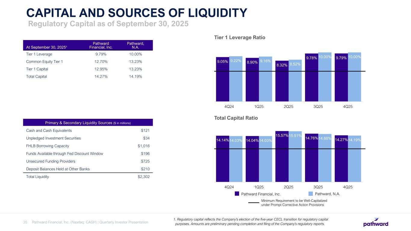 Pathward Financial, Inc. (Nasdaq: CASH) | Quarterly Investor Presentation34 ASSET QUALITY $15.6 $15.8 $13.2 $7.5 $16.5 1.33% 1.36% 1.18% 0.65% 1.33%1.33% 1.39% 1.34% 1.13% 1.13% 4Q24 1Q25 2Q25 3Q25 4Q25 Period Ended Adj. NCOs Adj. NCOs / Adj. Average Loans Adj. NCOs / Adj. Average Loans - LTM Adjusted Net Charge-Offs (“NCOs”)1 Excludes Tax Services NCOs and Related Seasonal Average Loans ($ in millions) KEY CREDIT METRICS • Annualized adjusted net charge-offs1: – 1.33% of average loans in 4Q25 – 1.13% of average loans over last 12 months • Allowance for credit loss (“ACL”) of $53.3 million as of September 30, 2025. • ACL as a % of total loans and leases was 1.14% for 4Q25, a 62 bps decrease from the prior year. • The increase in NPAs / NPLs compared to the sequential quarter was driven by an increase in nonperforming loans in the commercial finance portfolio and to a lesser extent, an increase in the seasonal tax services portfolio, partially offset by a decrease in the consumer finance portfolio. 1. See appendix for non-GAAP financial measures reconciliation. Tax services NCOs and related seasonal average loans are excluded to adjust for the cyclicality of activity related to the overall economics of the tax services business line. $41.6 $35.2 $39.8 $71.3 $99.1 0.87% 0.76% 0.88% 1.49% 2.05% 4Q24 1Q25 2Q25 3Q25 4Q25 Period Ended NPLs NPLs / Total Loans Nonperforming Assets (“NPAs”) ($ in millions) Nonperforming Loans (“NPLs”) ($ in millions) $43.0 $37.5 $41.6 $74.7 $101.7 0.57% 0.49% 0.59% 1.03% 1.42% 4Q24 1Q25 2Q25 3Q25 4Q25 Period Ended NPAs NPAs / Total Assets The net charge-off activity presented in the above graph includes the gross accounting treatment over certain consumer lending programs, under which consumer lending charge-offs are protected by layers of credit support in the waterfall structure. The benefit of the credit enhancements related to these charge-offs are received and recorded separately in other noninterest expense.