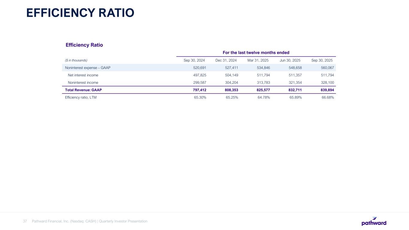 Pathward Financial, Inc. (Nasdaq: CASH) | Quarterly Investor Presentation37 EFFICIENCY RATIO For the last twelve months ended ($ in thousands) Sep 30, 2024 Dec 31, 2024 Mar 31, 2025 Jun 30, 2025 Sep 30, 2025 Noninterest expense – GAAP 520,691 527,411 534,846 548,658 560,067 Net interest income 497,825 504,149 511,794 511,357 511,794 Noninterest income 299,587 304,204 313,783 321,354 328,100 Total Revenue: GAAP 797,412 808,353 825,577 832,711 839,894 Efficiency ratio, LTM 65.30% 65.25% 64.78% 65.89% 66.68% Efficiency Ratio