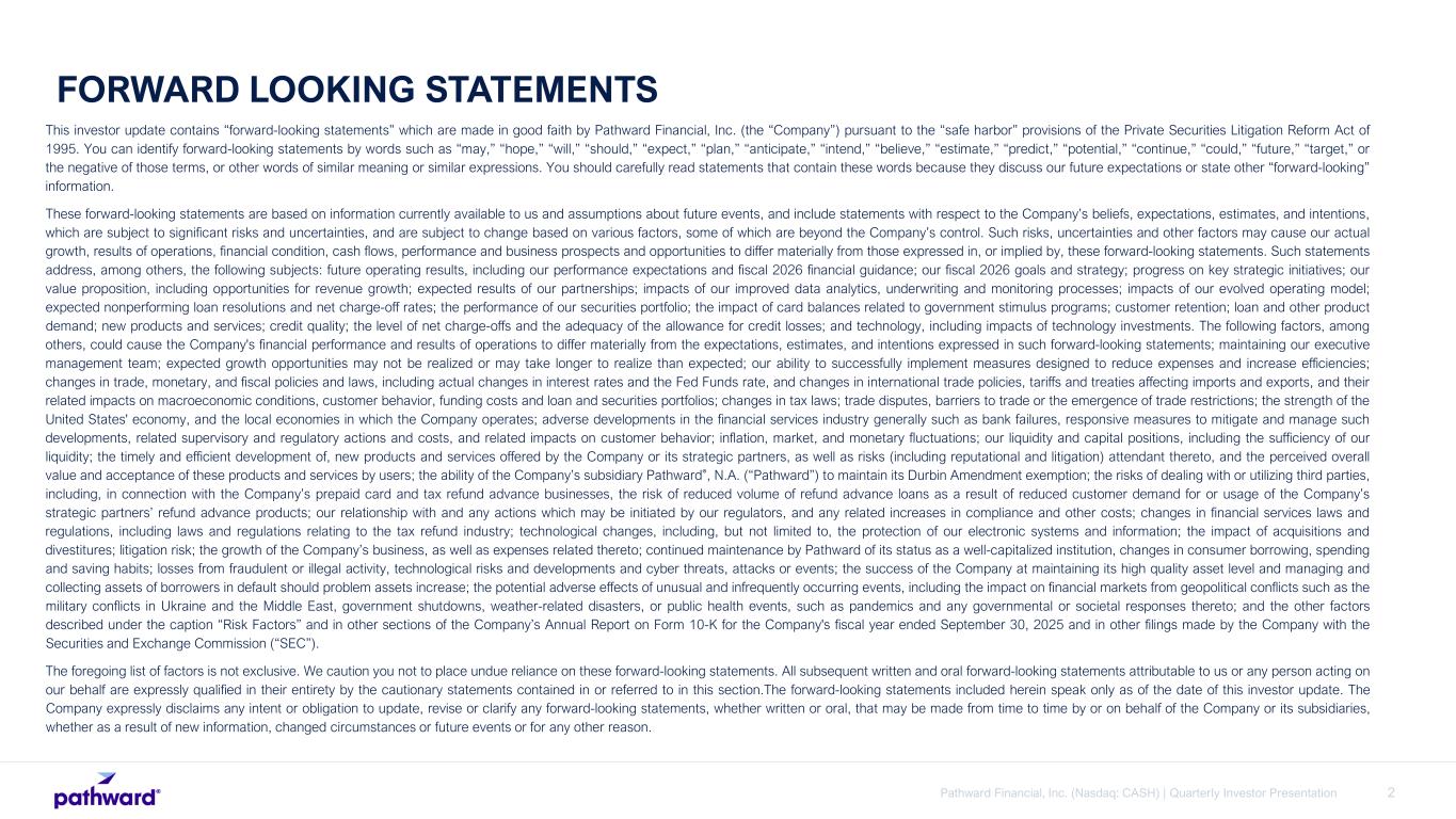 2Pathward Financial, Inc. (Nasdaq: CASH) | Quarterly Investor Presentation FORWARD LOOKING STATEMENTS This investor update contains “forward-looking statements” which are made in good faith by Pathward Financial, Inc. (the “Company”) pursuant to the “safe harbor” provisions of the Private Securities Litigation Reform Act of 1995. You can identify forward-looking statements by words such as “may,” “hope,” “will,” “should,” “expect,” “plan,” “anticipate,” “intend,” “believe,” “estimate,” “predict,” “potential,” “continue,” “could,” “future,” “target,” or the negative of those terms, or other words of similar meaning or similar expressions. You should carefully read statements that contain these words because they discuss our future expectations or state other “forward-looking” information. These forward-looking statements are based on information currently available to us and assumptions about future events, and include statements with respect to the Company’s beliefs, expectations, estimates, and intentions, which are subject to significant risks and uncertainties, and are subject to change based on various factors, some of which are beyond the Company’s control. Such risks, uncertainties and other factors may cause our actual growth, results of operations, financial condition, cash flows, performance and business prospects and opportunities to differ materially from those expressed in, or implied by, these forward-looking statements. Such statements address, among others, the following subjects: future operating results, including our performance expectations and fiscal 2026 financial guidance; our fiscal 2026 goals and strategy; progress on key strategic initiatives; our value proposition, including opportunities for revenue growth; expected results of our partnerships; impacts of our improved data analytics, underwriting and monitoring processes; impacts of our evolved operating model; expected nonperforming loan resolutions and net charge-off rates; the performance of our securities portfolio; the impact of card balances related to government stimulus programs; customer retention; loan and other product demand; new products and services; credit quality; the level of net charge-offs and the adequacy of the allowance for credit losses; and technology, including impacts of technology investments. The following factors, among others, could cause the Company's financial performance and results of operations to differ materially from the expectations, estimates, and intentions expressed in such forward-looking statements; maintaining our executive management team; expected growth opportunities may not be realized or may take longer to realize than expected; our ability to successfully implement measures designed to reduce expenses and increase efficiencies; changes in trade, monetary, and fiscal policies and laws, including actual changes in interest rates and the Fed Funds rate, and changes in international trade policies, tariffs and treaties affecting imports and exports, and their related impacts on macroeconomic conditions, customer behavior, funding costs and loan and securities portfolios; changes in tax laws; trade disputes, barriers to trade or the emergence of trade restrictions; the strength of the United States' economy, and the local economies in which the Company operates; adverse developments in the financial services industry generally such as bank failures, responsive measures to mitigate and manage such developments, related supervisory and regulatory actions and costs, and related impacts on customer behavior; inflation, market, and monetary fluctuations; our liquidity and capital positions, including the sufficiency of our liquidity; the timely and efficient development of, new products and services offered by the Company or its strategic partners, as well as risks (including reputational and litigation) attendant thereto, and the perceived overall value and acceptance of these products and services by users; the ability of the Company’s subsidiary Pathward®, N.A. (“Pathward”) to maintain its Durbin Amendment exemption; the risks of dealing with or utilizing third parties, including, in connection with the Company’s prepaid card and tax refund advance businesses, the risk of reduced volume of refund advance loans as a result of reduced customer demand for or usage of the Company’s strategic partners’ refund advance products; our relationship with and any actions which may be initiated by our regulators, and any related increases in compliance and other costs; changes in financial services laws and regulations, including laws and regulations relating to the tax refund industry; technological changes, including, but not limited to, the protection of our electronic systems and information; the impact of acquisitions and divestitures; litigation risk; the growth of the Company’s business, as well as expenses related thereto; continued maintenance by Pathward of its status as a well-capitalized institution, changes in consumer borrowing, spending and saving habits; losses from fraudulent or illegal activity, technological risks and developments and cyber threats, attacks or events; the success of the Company at maintaining its high quality asset level and managing and collecting assets of borrowers in default should problem assets increase; the potential adverse effects of unusual and infrequently occurring events, including the impact on financial markets from geopolitical conflicts such as the military conflicts in Ukraine and the Middle East, government shutdowns, weather-related disasters, or public health events, such as pandemics and any governmental or societal responses thereto; and the other factors described under the caption “Risk Factors” and in other sections of the Company’s Annual Report on Form 10-K for the Company's fiscal year ended September 30, 2025 and