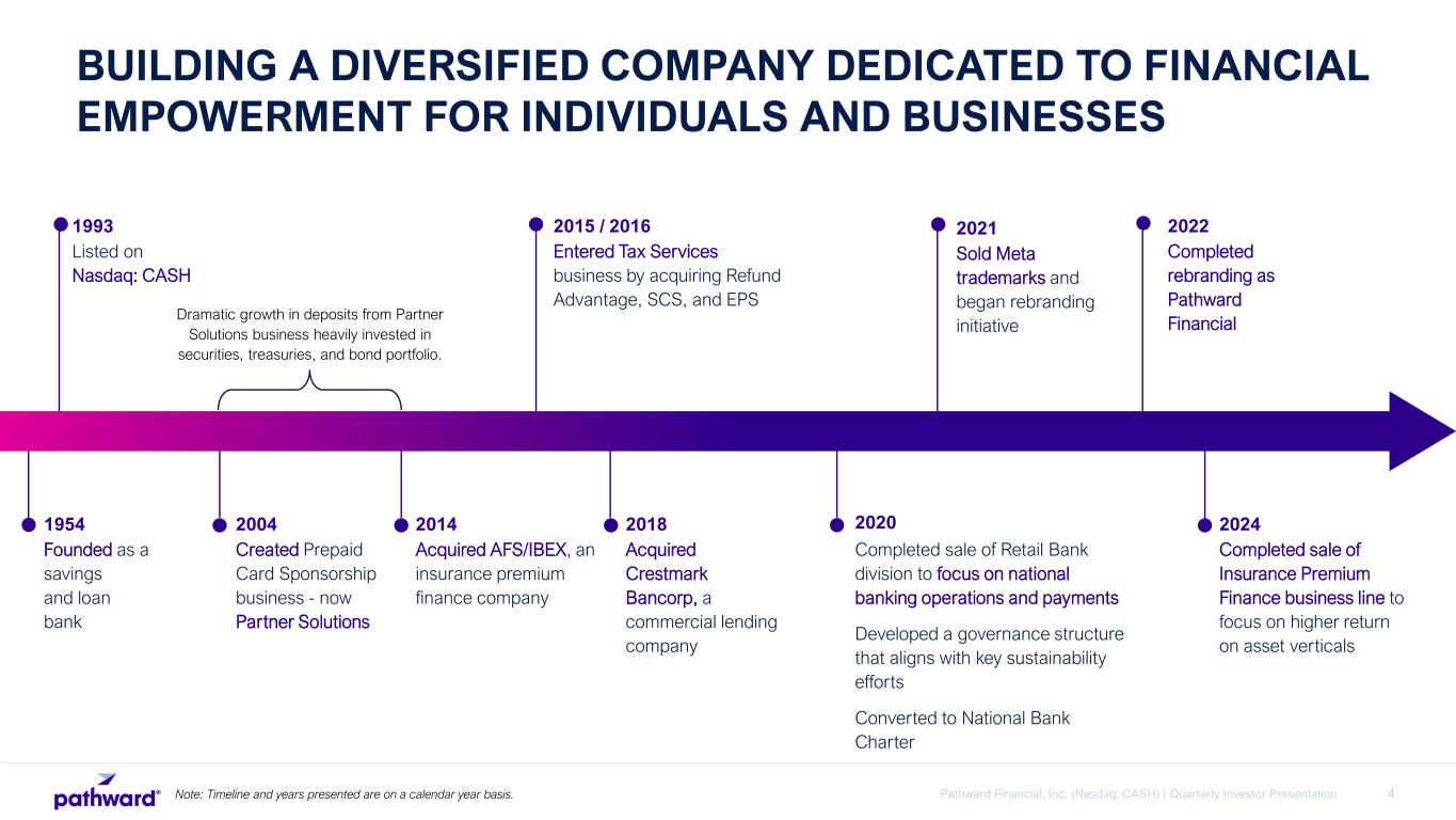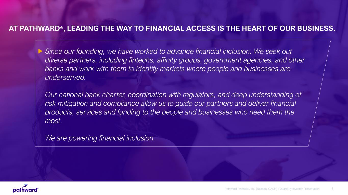3Pathward Financial, Inc. (Nasdaq: CASH) | Quarterly Investor Presentation Since our founding, we have worked to advance financial inclusion. We seek out diverse partners, including fintechs, affinity groups, government agencies, and other banks and work with them to identify markets where people and businesses are underserved. Our national bank charter, coordination with regulators, and deep understanding of risk mitigation and compliance allow us to guide our partners and deliver financial products, services and funding to the people and businesses who need them the most. We are powering financial inclusion. AT PATHWARD®, LEADING THE WAY TO FINANCIAL ACCESS IS THE HEART OF OUR BUSINESS.