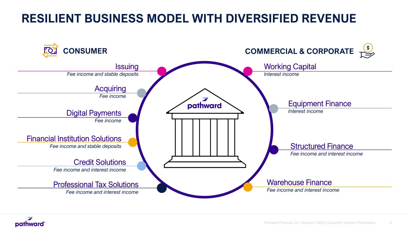 4Pathward Financial, Inc. (Nasdaq: CASH) | Quarterly Investor Presentation BUILDING A DIVERSIFIED COMPANY DEDICATED TO FINANCIAL EMPOWERMENT FOR INDIVIDUALS AND BUSINESSES 1993 Listed on Nasdaq: CASH 2015 / 2016 Entered Tax Services business by acquiring Refund Advantage, SCS, and EPS 2020 Completed sale of Retail Bank division to focus on national banking operations and payments Developed a governance structure that aligns with key sustainability efforts Converted to National Bank Charter 2004 Created Prepaid Card Sponsorship business - now Partner Solutions 2014 Acquired AFS/IBEX, an insurance premium finance company 2018 Acquired Crestmark Bancorp, a commercial lending company Dramatic growth in deposits from Partner Solutions business heavily invested in securities, treasuries, and bond portfolio. 1954 Founded as a savings and loan bank 2021 Sold Meta trademarks and began rebranding initiative 2022 Completed rebranding as Pathward Financial 2024 Completed sale of Insurance Premium Finance business line to focus on higher return on asset verticals Note: Timeline and years presented are on a calendar year basis.