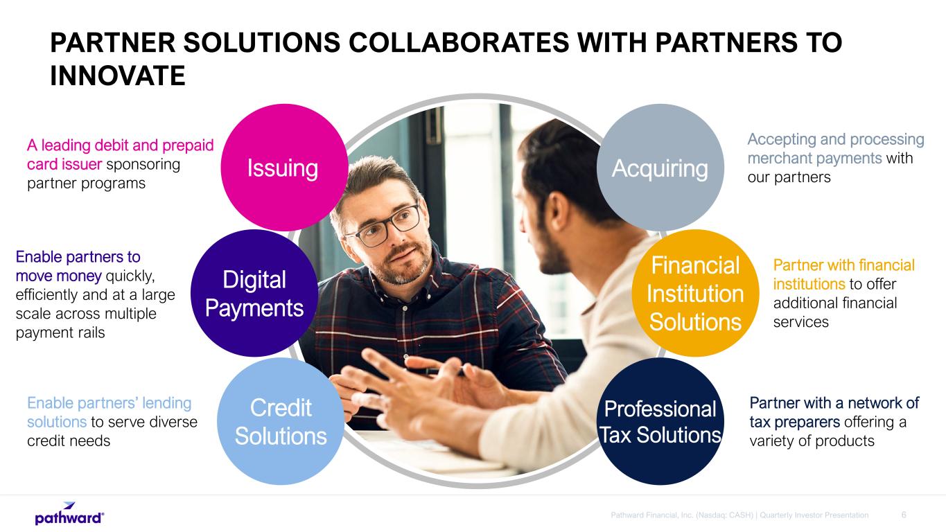 5Pathward Financial, Inc. (Nasdaq: CASH) | Quarterly Investor Presentation RESILIENT BUSINESS MODEL WITH DIVERSIFIED REVENUE Issuing Fee income and stable deposits Acquiring Fee income Digital Payments Fee income Financial Institution Solutions Fee income and stable deposits Credit Solutions Fee income and interest income Professional Tax Solutions Fee income and interest income Working Capital Interest income Equipment Finance Interest income Structured Finance Fee income and interest income Warehouse Finance Fee income and interest income CONSUMER COMMERCIAL & CORPORATE