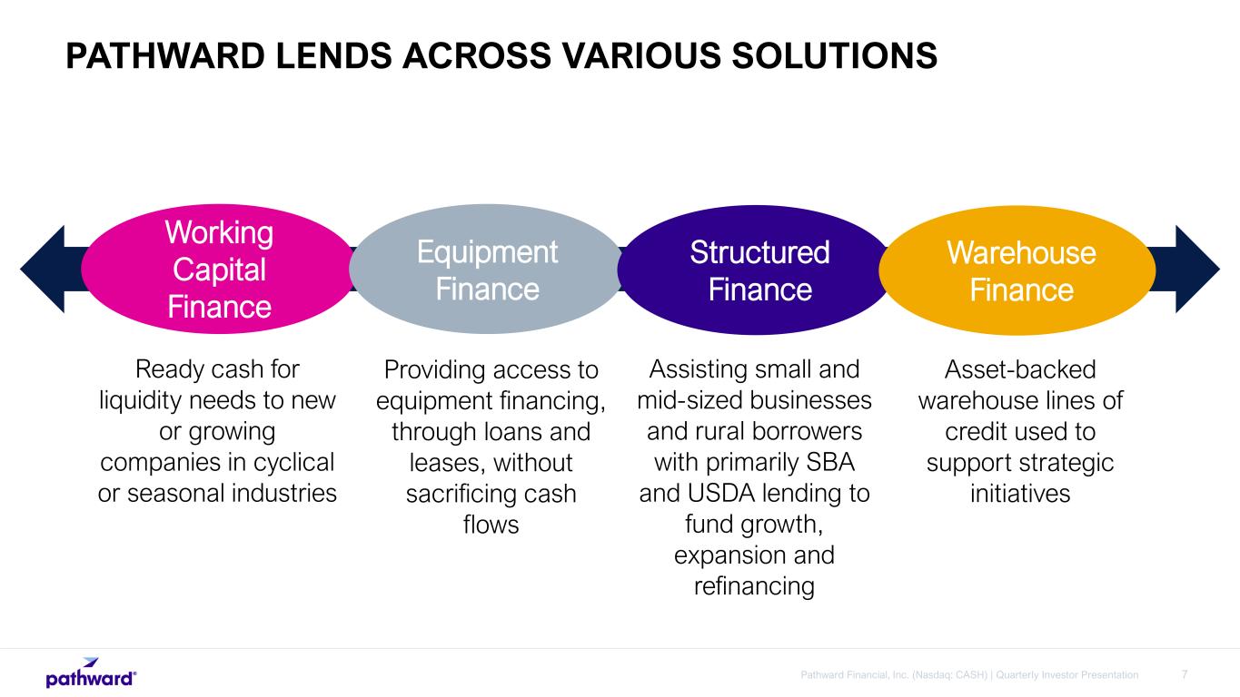 6Pathward Financial, Inc. (Nasdaq: CASH) | Quarterly Investor Presentation Issuing Acquiring Digital Payments Financial Institution Solutions Credit Solutions Professional Tax Solutions A leading debit and prepaid card issuer sponsoring partner programs Enable partners’ lending solutions to serve diverse credit needs Partner with a network of tax preparers offering a variety of products Partner with financial institutions to offer additional financial services Enable partners to move money quickly, efficiently and at a large scale across multiple payment rails Accepting and processing merchant payments with our partners PARTNER SOLUTIONS COLLABORATES WITH PARTNERS TO INNOVATE
