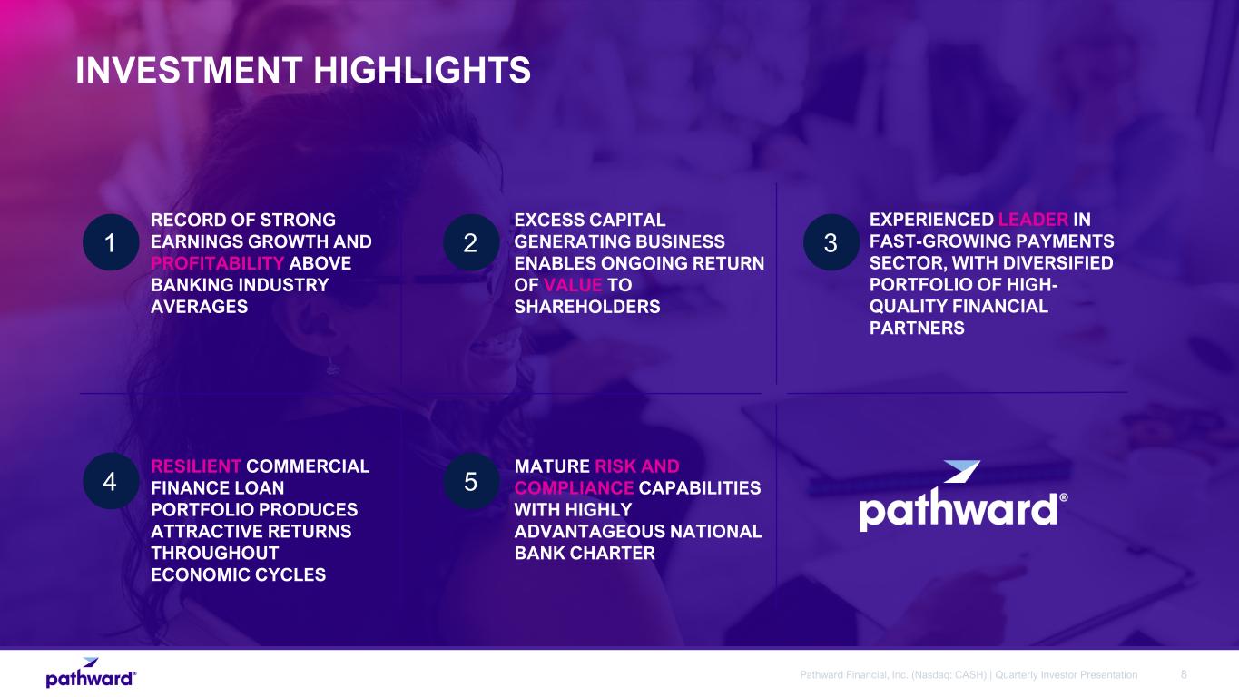 7Pathward Financial, Inc. (Nasdaq: CASH) | Quarterly Investor Presentation Working Capital Finance Equipment Finance Structured Finance Ready cash for liquidity needs to new or growing companies in cyclical or seasonal industries Providing access to equipment financing, through loans and leases, without sacrificing cash flows Assisting small and mid-sized businesses and rural borrowers with primarily SBA and USDA lending to fund growth, expansion and refinancing Warehouse Finance Asset-backed warehouse lines of credit used to support strategic initiatives PATHWARD LENDS ACROSS VARIOUS SOLUTIONS