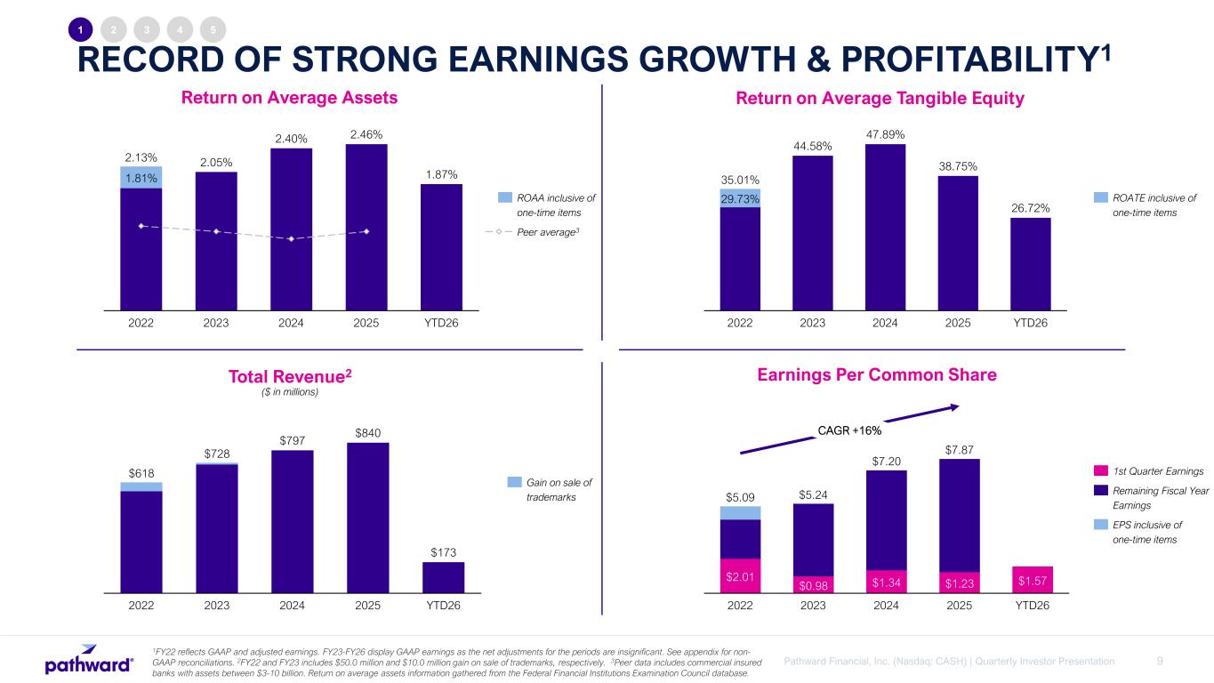 8Pathward Financial, Inc. (Nasdaq: CASH) | Quarterly Investor Presentation RECORD OF STRONG EARNINGS GROWTH AND PROFITABILITY ABOVE BANKING INDUSTRY AVERAGES EXCESS CAPITAL GENERATING BUSINESS ENABLES ONGOING RETURN OF VALUE TO SHAREHOLDERS INVESTMENT HIGHLIGHTS 2 3 4 1 5 EXPERIENCED LEADER IN FAST-GROWING PAYMENTS SECTOR, WITH DIVERSIFIED PORTFOLIO OF HIGH- QUALITY FINANCIAL PARTNERS RESILIENT COMMERCIAL FINANCE LOAN PORTFOLIO PRODUCES ATTRACTIVE RETURNS THROUGHOUT ECONOMIC CYCLES MATURE RISK AND COMPLIANCE CAPABILITIES WITH HIGHLY ADVANTAGEOUS NATIONAL BANK CHARTER