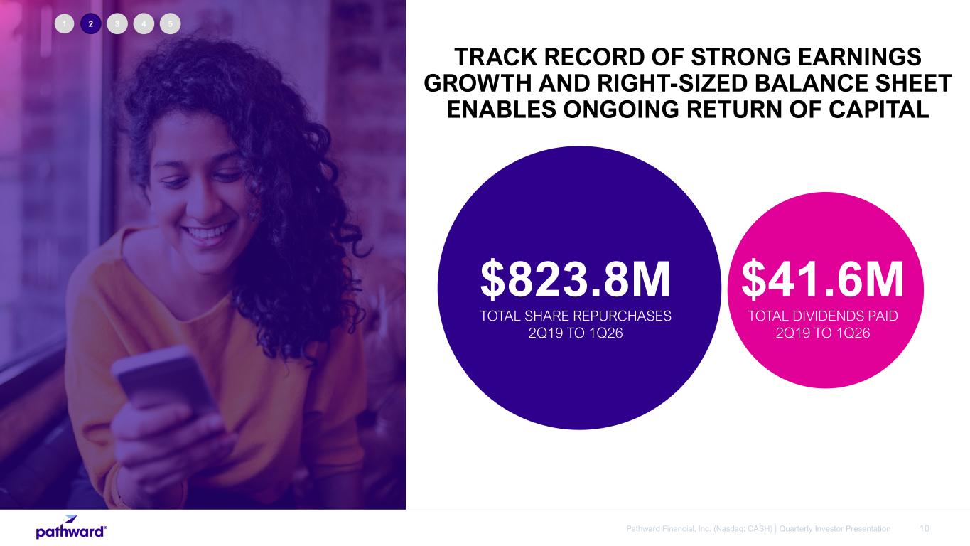 9Pathward Financial, Inc. (Nasdaq: CASH) | Quarterly Investor Presentation Earnings Per Common Share RECORD OF STRONG EARNINGS GROWTH & PROFITABILITY1 Return on Average Assets Total Revenue2 ($ in millions) 1FY22 reflects GAAP and adjusted earnings. FY23-FY26 display GAAP earnings as the net adjustments for the periods are insignificant. See appendix for non- GAAP reconciliations. 2FY22 and FY23 includes $50.0 million and $10.0 million gain on sale of trademarks, respectively. 3Peer data includes commercial insured banks with assets between $3-10 billion. Return on average assets information gathered from the Federal Financial Institutions Examination Council database. 1 2 3 4 5 $797 $840 $173 2022 2023 2024 2025 YTD26 $618 $728 Gain on sale of trademarks $2.01 $0.98 $1.34 $1.23 $1.57 2022 2023 2024 2025 YTD26 $5.09 $5.24 $7.20 $7.87 CAGR +16% 2.05% 2.40% 2.46% 1.87%1.81% 2022 2023 2024 2025 YTD26 2.13% ROAA inclusive of one-time items Peer average3 44.58% 47.89% 38.75% 26.72% 29.73% 2022 2023 2024 2025 YTD26 35.01% ROATE inclusive of one-time items Return on Average Tangible Equity 1st Quarter Earnings Remaining Fiscal Year Earnings EPS inclusive of one-time items
