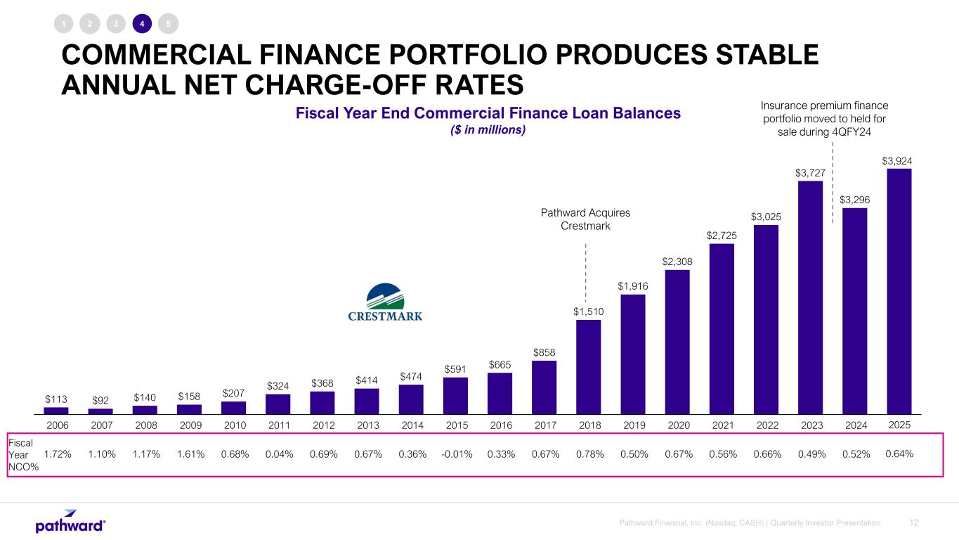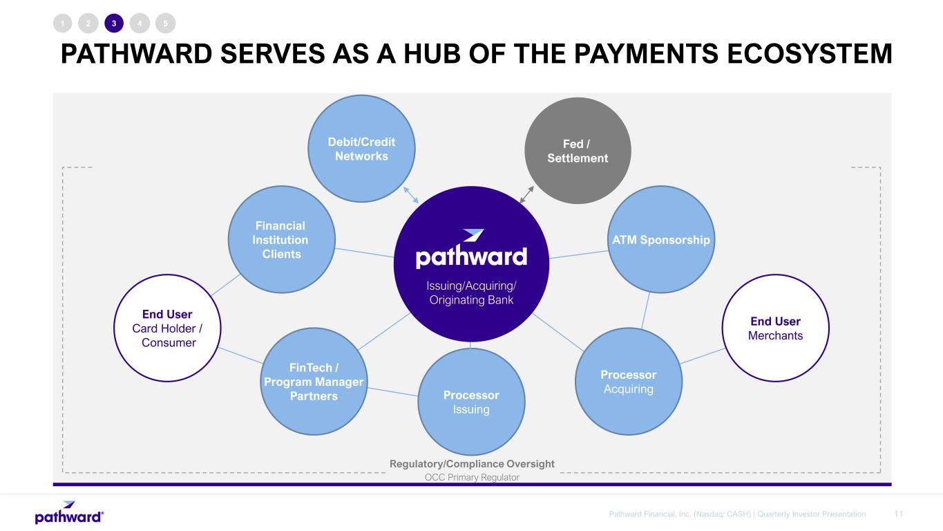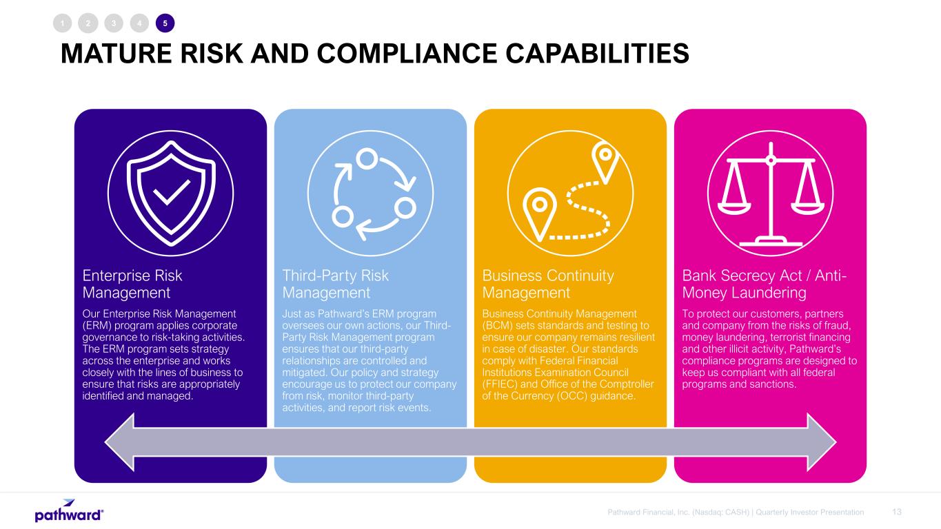 11Pathward Financial, Inc. (Nasdaq: CASH) | Quarterly Investor Presentation 1 2 3 4 5 Fed / Settlement ATM Sponsorship Processor AcquiringProcessor Issuing FinTech / Program Manager Partners Financial Institution Clients Debit/Credit Networks End User Card Holder / Consumer End User Merchants Issuing/Acquiring/ Originating Bank Regulatory/Compliance Oversight OCC Primary Regulator PATHWARD SERVES AS A HUB OF THE PAYMENTS ECOSYSTEM