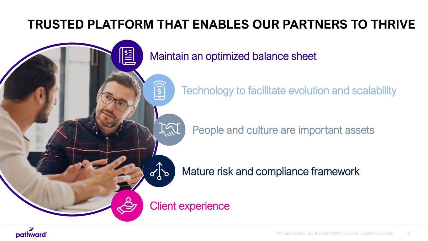 15Pathward Financial, Inc. (Nasdaq: CASH) | Quarterly Investor Presentation Money Movement Payments Facilitation Issuing Sponsorship Merchant Acquiring Sponsorship Independent ATM Sponsorship Consumer Credit Sponsorship Digital Payments Tax Solutions Deposit Generation Prepaid Cards Gift Cards Loyalty Cards Payroll Cards General Purpose Reloadable Cards Lending Solutions Working Capital Equipment Finance Structured Finance Warehouse Finance Credit Solutions PATHWARD’S BUSINESS