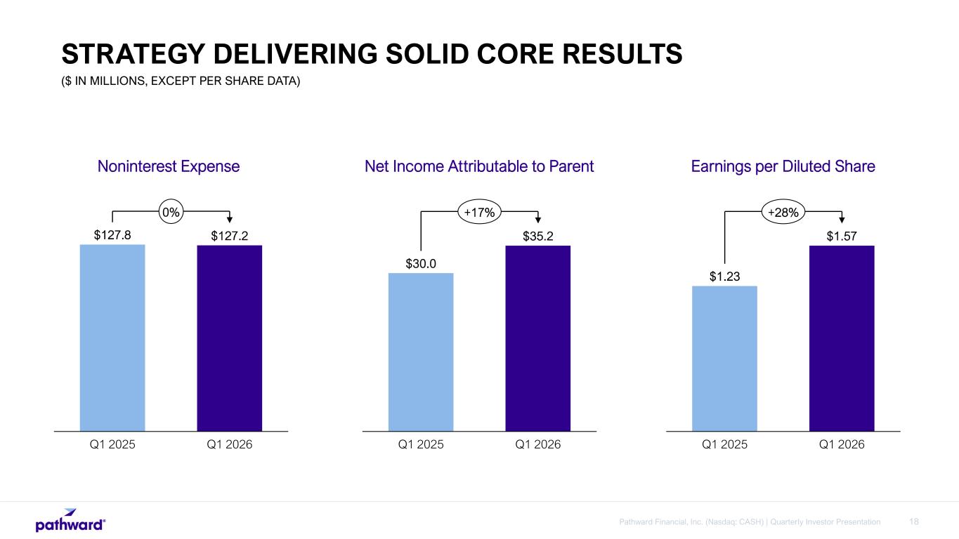 17Pathward Financial, Inc. (Nasdaq: CASH) | Quarterly Investor Presentation ($ IN MILLIONS) Net Interest Income Noninterest Income STRATEGY DELIVERING SOLID CORE RESULTS $9.2 $1.2 Q1 2025 -$11.9 Sale of Consumer Loans1 -$3.1 Investment Portfolio -$1.0 Credit Solutions -$0.4 Other Commercial Finance Interest Expense Q1 2026 $125.3 $119.3 $2.3 Q1 2025 -$2.1 Rental Income -$1.5 Total Gain on Sale -$1.1 Servicing Fee Income -$0.4 Tax Products -$0.8 Other Income Core Card and Deposit Fees Q1 2026 $57.4 $53.8 1. Reflects Q1 2025 interest income of the loans included in the consumer finance portfolio sale in October 2025.
