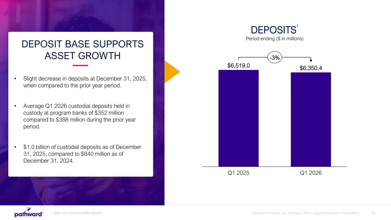 18Pathward Financial, Inc. (Nasdaq: CASH) | Quarterly Investor Presentation $30.0 $35.2 Q1 2025 Q1 2026 +17% Net Income Attributable to Parent $1.23 $1.57 Q1 2025 Q1 2026 +28% Earnings per Diluted Share $127.8 $127.2 Q1 2025 Q1 2026 0% Noninterest Expense ($ IN MILLIONS, EXCEPT PER SHARE DATA) STRATEGY DELIVERING SOLID CORE RESULTS