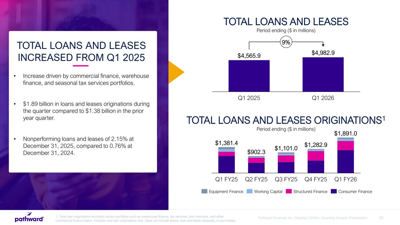 20Pathward Financial, Inc. (Nasdaq: CASH) | Quarterly Investor Presentation TOTAL LOANS AND LEASES INCREASED FROM Q1 2025 • Increase driven by commercial finance, warehouse finance, and seasonal tax services portfolios. • $1.89 billion in loans and leases originations during the quarter compared to $1.38 billion in the prior year quarter. • Nonperforming loans and leases of 2.15% at December 31, 2025, compared to 0.76% at December 31, 2024. $4,565.9 $4,982.9 Q1 2025 Q1 2026 9% TOTAL LOANS AND LEASES Period ending ($ in millions) Q1 FY25 Q2 FY25 Q3 FY25 Q4 FY25 Q1 FY26 $1,381.4 $902.3 $1,101.0 $1,282.9 $1,891.0 TOTAL LOANS AND LEASES ORIGINATIONS1 Period ending ($ in millions) Equipment Finance Working Capital Structured Finance Consumer Finance 1. Total loan originations excludes certain portfolios such as warehouse finance, tax services, joint ventures, and other commercial finance loans. Includes new loan originations only. Does not include draws, loan and lease renewals, or purchases.