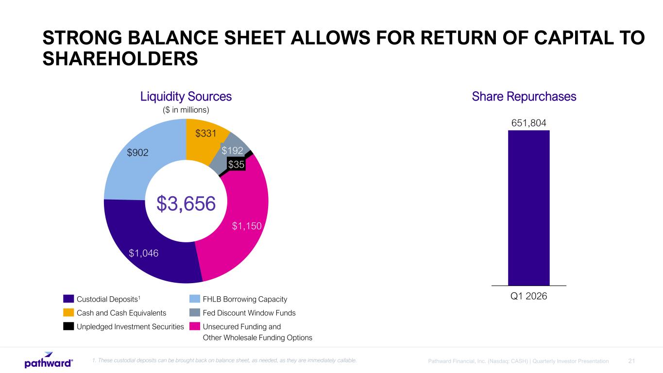 19Pathward Financial, Inc. (Nasdaq: CASH) | Quarterly Investor Presentation • Slight decrease in deposits at December 31, 2025, when compared to the prior year period. • Average Q1 2026 custodial deposits held in custody at program banks of $352 million compared to $388 million during the prior year period. • $1.0 billion of custodial deposits as of December 31, 2025, compared to $840 million as of December 31, 2024. DEPOSIT BASE SUPPORTS ASSET GROWTH $6,519.0 $6,350.4 Q1 2025 Q1 2026 -3% DEPOSITS 1 Period ending ($ in millions) 1. Does not include custodial deposits.