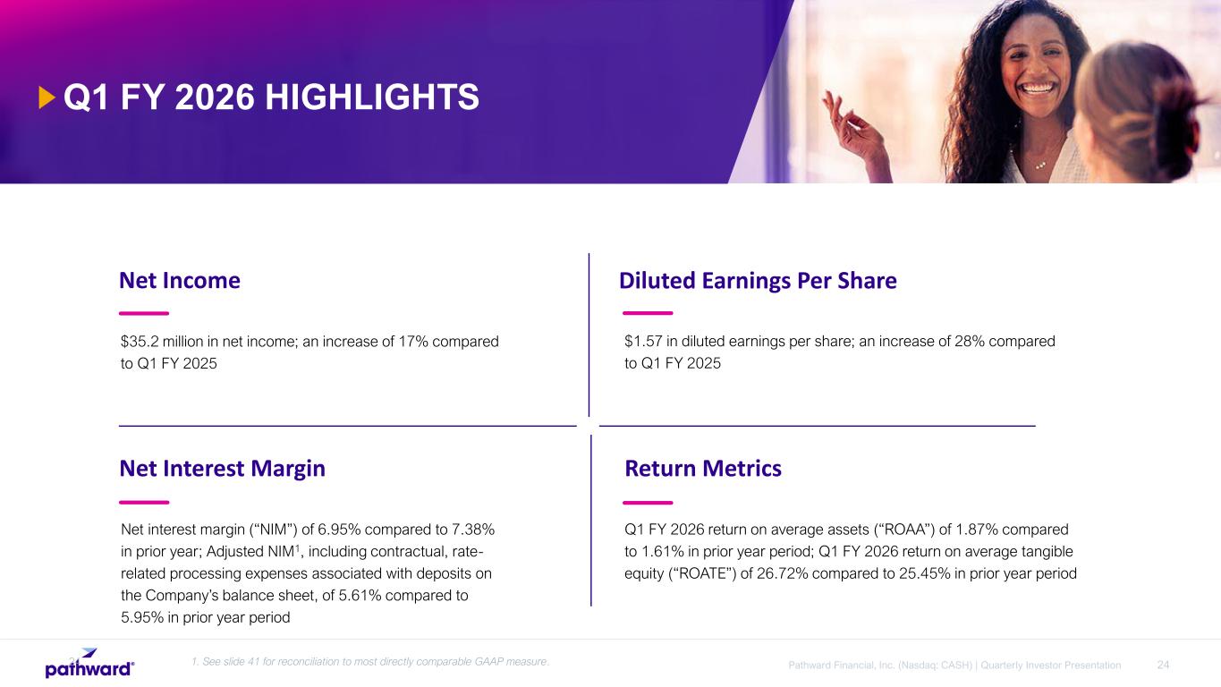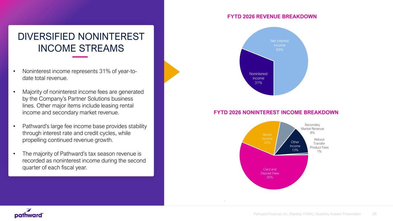 24Pathward Financial, Inc. (Nasdaq: CASH) | Quarterly Investor Presentation Net Income $35.2 million in net income; an increase of 17% compared to Q1 FY 2025 Diluted Earnings Per Share $1.57 in diluted earnings per share; an increase of 28% compared to Q1 FY 2025 Net Interest Margin Net interest margin (“NIM”) of 6.95% compared to 7.38% in prior year; Adjusted NIM1, including contractual, rate- related processing expenses associated with deposits on the Company’s balance sheet, of 5.61% compared to 5.95% in prior year period Return Metrics Q1 FY 2026 return on average assets (“ROAA”) of 1.87% compared to 1.61% in prior year period; Q1 FY 2026 return on average tangible equity (“ROATE”) of 26.72% compared to 25.45% in prior year period Q1 FY 2026 HIGHLIGHTS 24 1. See slide 41 for reconciliation to most directly comparable GAAP measure.