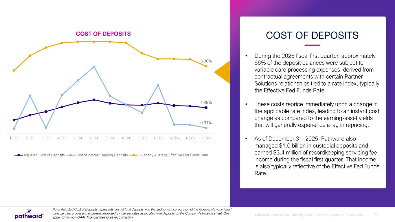 41Pathward Financial, Inc. (Nasdaq: CASH) | Quarterly Investor Presentation NON-GAAP RECONCILIATION . For the quarter ended ($ in thousands) Dec-22 Mar-23 Jun-23 Sep-23 Dec-23 Mar-24 Jun-24 Sep-24 Dec-24 Mar-25 Jun-25 Sep-25 Dec-25 Average interest earning assets 5,935,926 6,719,545 6,328,718 6,727,076 7,035,624 7,638,907 6,804,507 6,928,365 6,736,877 7,761,138 6,602,267 6,803,398 6,812,693 Net interest income 88,430 105,673 102,815 114,158 118,927 128,634 122,750 127,514 125,251 136,279 122,313 127,953 119,338 Net interest margin 5.91% 6.38% 6.52% 6.73% 6.72% 6.77% 7.26% 7.32% 7.38% 7.12% 7.43% 7.46% 6.95% Average total deposits 5,636,658 6,386,592 5,895,242 6,204,934 6,558,189 7,168,673 6,260,990 6,199,271 6,081,236 7,181,308 6,002,547 6,185,496 6,173,866 Deposit interest expense 142 2,096 164 1,954 3,526 6,685 1,689 1,119 775 4,086 287 283 206 Cost of deposits 0.01% 0.13% 0.01% 0.12% 0.21% 0.38% 0.11% 0.07% 0.05% 0.23% 0.02% 0.02% 0.01% Net Interest Margin and Cost of Deposits Adjusted Net Interest Margin With Contractual, Rate-Related Card Expenses Associated With Deposits on the Company’s Balance Sheet For the quarter ended ($ in thousands) Dec-22 Mar-23 Jun-23 Sep-23 Dec-23 Mar-24 Jun-24 Sep-24 Dec-24 Mar-25 Jun-25 Sep-25 Dec-25 Average interest earning assets 5,935,926 6,719,545 6,328,718 6,727,076 7,035,624 7,638,907 6,804,507 6,928,365 6,736,877 7,761,138 6,602,267 6,803,398 6,812,693 Net interest income 88,430 105,673 102,815 114,158 118,927 128,634 122,750 127,514 125,251 136,279 122,313 127,953 119,338 Less: Contractual, rate-related processing expense 10,660 14,415 18,358 21,929 25,891 28,024 25,320 24.631 24,241 26,852 23,831 24,346 23,013 Adjusted net interest income 77,770 91,258 84,457 92,229 93,036 100,610 97,430 102,883 101,010 109,427 98,482 103,607 96,325 Adjusted net interest margin 5.20% 5.51% 5.35% 5.44% 5.26% 5.30% 5.76% 5.91% 5.95% 5.72% 5.98% 6.04% 5.61% Average total deposits 5,636,658 6,386,592 5,895,242 6,204,934 6,558,189 7,168,673 6,260,990 6,199,271 6,081,236 7,181,308 6,002,547 6,185,496 6,173,866 Deposit interest expense 142 2,096 164 1,954 3,526 6,685 1,689 1,119 775 4,086 287 283 206 Add: Contractual, rate-related processing expense 10,660 14,415 18,358 21,929 25,891 28,024 25,320 24,631 24,241 26,852 23,831 24,346 23,013 Adjusted deposit expense 10,802 16,511 18,522 23,883 29,417 34,709 27,009 25,750 25,016 30,938 24,118 24,629 23,219 Adjusted cost of deposits 0.76% 1.05% 1.26% 1.53% 1.78% 1.95% 1.74% 1.65% 1.63% 1.75% 1.61% 1.58% 1.49%