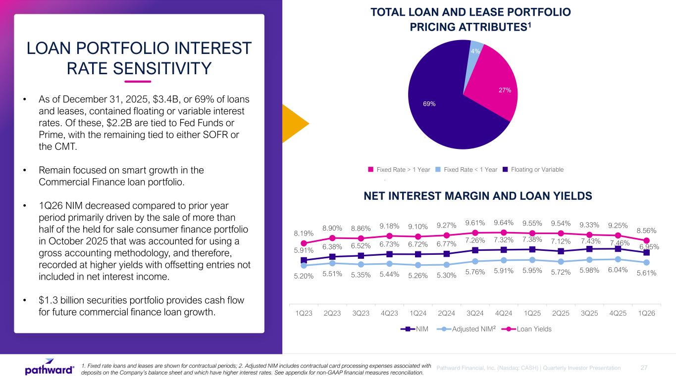 26Pathward Financial, Inc. (Nasdaq: CASH) | Quarterly Investor Presentation • During the 2026 fiscal first quarter, approximately 66% of the deposit balances were subject to variable card processing expenses, derived from contractual agreements with certain Partner Solutions relationships tied to a rate index, typically the Effective Fed Funds Rate. • These costs reprice immediately upon a change in the applicable rate index, leading to an instant cost change as compared to the earning-asset yields that will generally experience a lag in repricing. • As of December 31, 2025, Pathward also managed $1.0 billion in custodial deposits and earned $3.4 million of recordkeeping servicing fee income during the fiscal first quarter. That income is also typically reflective of the Effective Fed Funds Rate. COST OF DEPOSITS COST OF DEPOSITS 1.49% 0.31% 3.90% 1Q23 2Q23 3Q23 4Q23 1Q24 2Q24 3Q24 4Q24 1Q25 2Q25 3Q25 4Q25 1Q26 Adjusted Cost of Deposits Cost of Interest Bearing Deposits Quarterly Average Effective Fed Funds Rate Note: Adjusted Cost of Deposits represents cost of total deposits with the additional incorporation of the Company’s noninterest variable card processing expenses impacted by interest rates associated with deposits on the Company’s balance sheet. See appendix for non-GAAP financial measures reconciliation.
