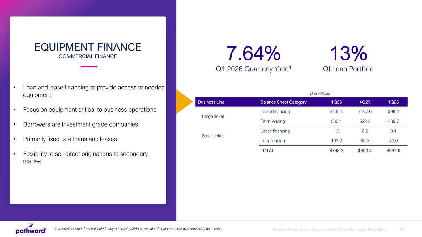 27Pathward Financial, Inc. (Nasdaq: CASH) | Quarterly Investor Presentation • As of December 31, 2025, $3.4B, or 69% of loans and leases, contained floating or variable interest rates. Of these, $2.2B are tied to Fed Funds or Prime, with the remaining tied to either SOFR or the CMT. • Remain focused on smart growth in the Commercial Finance loan portfolio. • 1Q26 NIM decreased compared to prior year period primarily driven by the sale of more than half of the held for sale consumer finance portfolio in October 2025 that was accounted for using a gross accounting methodology, and therefore, recorded at higher yields with offsetting entries not included in net interest income. • $1.3 billion securities portfolio provides cash flow for future commercial finance loan growth. LOAN PORTFOLIO INTEREST RATE SENSITIVITY . 69% 4% 27% Fixed Rate > 1 Year TOTAL LOAN AND LEASE PORTFOLIO PRICING ATTRIBUTES1 Fixed Rate < 1 Year Floating or Variable NET INTEREST MARGIN AND LOAN YIELDS 5.91% 6.38% 6.52% 6.73% 6.72% 6.77% 7.26% 7.32% 7.38% 7.12% 7.43% 7.46% 6.95% 5.20% 5.51% 5.35% 5.44% 5.26% 5.30% 5.76% 5.91% 5.95% 5.72% 5.98% 6.04% 5.61% 8.19% 8.90% 8.86% 9.18% 9.10% 9.27% 9.61% 9.64% 9.55% 9.54% 9.33% 9.25% 8.56% 1Q23 2Q23 3Q23 4Q23 1Q24 2Q24 3Q24 4Q24 1Q25 2Q25 3Q25 4Q25 1Q26 NIM Adjusted NIM Loan Yields 1. Fixed rate loans and leases are shown for contractual periods; 2. Adjusted NIM includes contractual card processing expenses associated with deposits on the Company’s balance sheet and which have higher interest rates. See appendix for non-GAAP financial measures reconciliation. 2