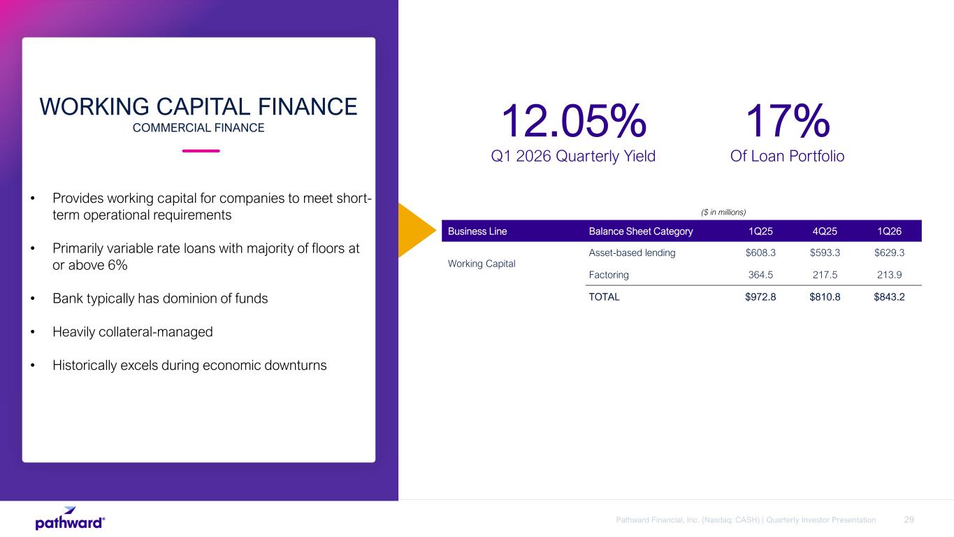 28Pathward Financial, Inc. (Nasdaq: CASH) | Quarterly Investor Presentation • Loan and lease financing to provide access to needed equipment • Focus on equipment critical to business operations • Borrowers are investment grade companies • Primarily fixed rate loans and leases • Flexibility to sell direct originations to secondary market EQUIPMENT FINANCE COMMERCIAL FINANCE 7.64% Q1 2026 Quarterly Yield1 13% Of Loan Portfolio Business Line Balance Sheet Category 1Q25 4Q25 1Q26 Large ticket Lease financing $133.5 $107.6 $98.2 Term lending 530.1 522.3 489.7 Small ticket Lease financing 1.5 0.2 0.1 Term lending 103.2 60.3 49.0 TOTAL $768.3 $690.4 $637.0 1. Interest income does not include any potential gain(loss) on sale of equipment that was previously on a lease. ($ in millions)