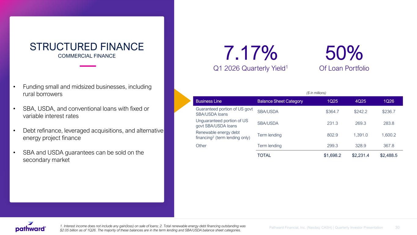 30Pathward Financial, Inc. (Nasdaq: CASH) | Quarterly Investor Presentation • Funding small and midsized businesses, including rural borrowers • SBA, USDA, and conventional loans with fixed or variable interest rates • Debt refinance, leveraged acquisitions, and alternative energy project finance • SBA and USDA guarantees can be sold on the secondary market STRUCTURED FINANCE COMMERCIAL FINANCE 7.17% Q1 2026 Quarterly Yield1 50% Of Loan Portfolio ($ in millions) Business Line Balance Sheet Category 1Q25 4Q25 1Q26 Guaranteed portion of US govt SBA/USDA loans SBA/USDA $364.7 $242.2 $236.7 Unguaranteed portion of US govt SBA/USDA loans SBA/USDA 231.3 269.3 283.8 Renewable energy debt financing2 (term lending only) Term lending 802.9 1,391.0 1,600.2 Other Term lending 299.3 328.9 367.8 TOTAL $1,698.2 $2,231.4 $2,488.5 1. Interest income does not include any gain(loss) on sale of loans; 2. Total renewable energy debt financing outstanding was $2.05 billion as of 1Q26. The majority of these balances are in the term lending and SBA/USDA balance sheet categories.