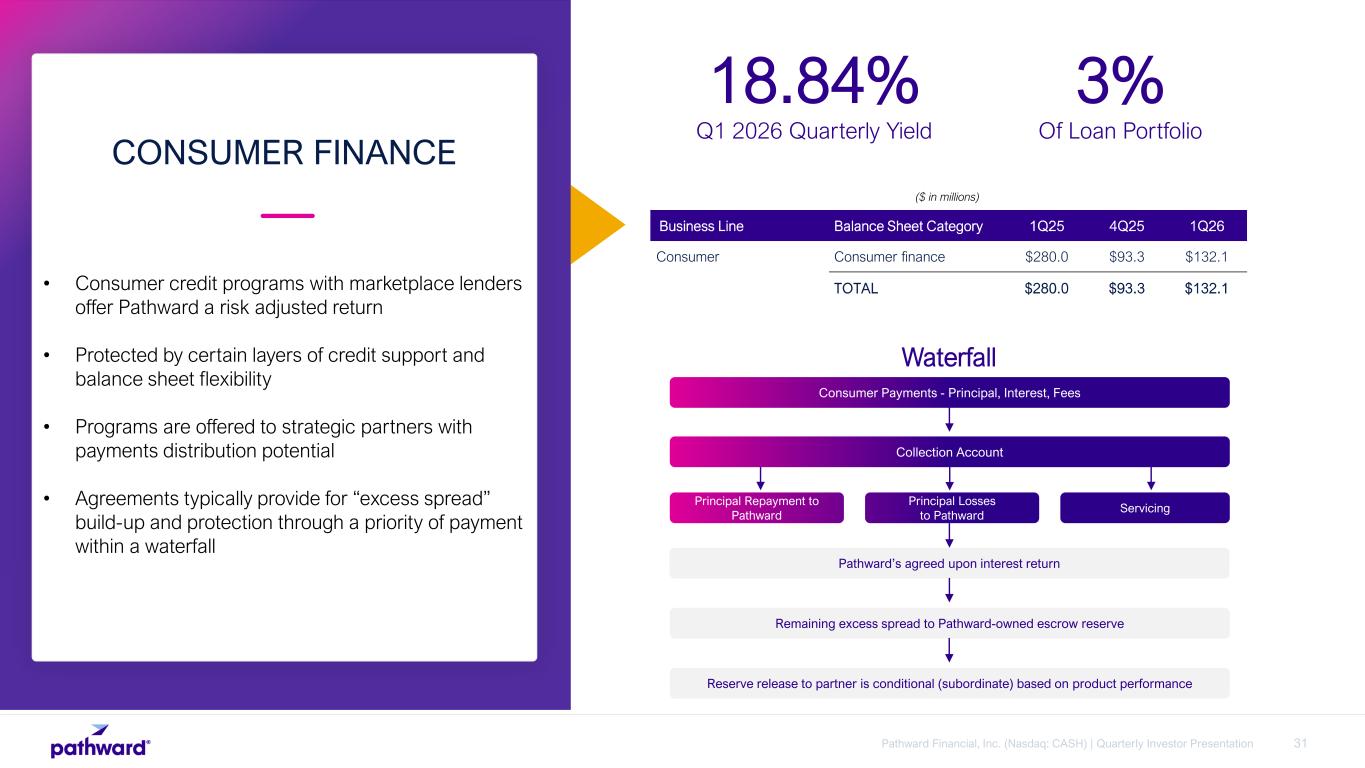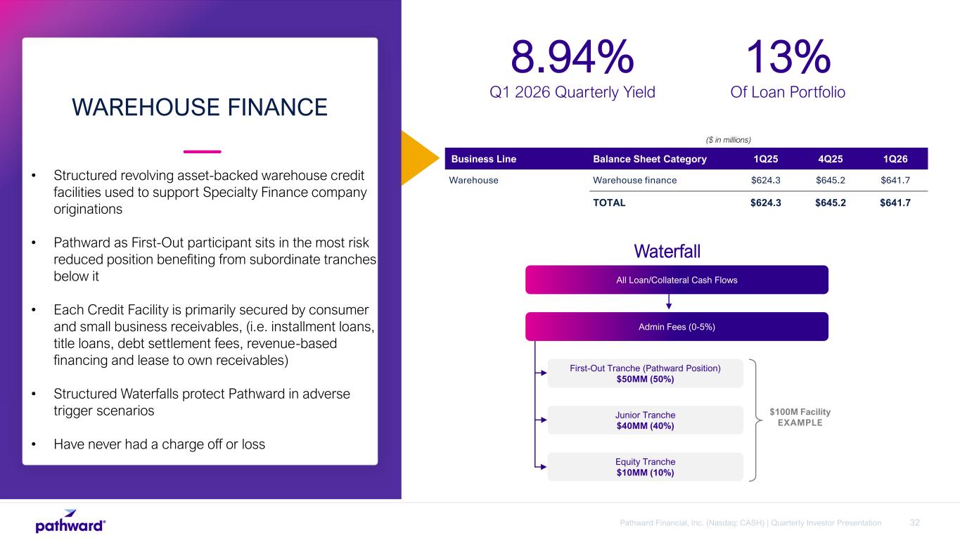 31Pathward Financial, Inc. (Nasdaq: CASH) | Quarterly Investor Presentation • Consumer credit programs with marketplace lenders offer Pathward a risk adjusted return • Protected by certain layers of credit support and balance sheet flexibility • Programs are offered to strategic partners with payments distribution potential • Agreements typically provide for “excess spread” build-up and protection through a priority of payment within a waterfall CONSUMER FINANCE 18.84% Q1 2026 Quarterly Yield 3% Of Loan Portfolio ($ in millions) Business Line Balance Sheet Category 1Q25 4Q25 1Q26 Consumer Consumer finance $280.0 $93.3 $132.1 TOTAL $280.0 $93.3 $132.1 Consumer Payments - Principal, Interest, Fees Collection Account Servicing Principal Losses to Pathward Principal Repayment to Pathward Pathward’s agreed upon interest return Remaining excess spread to Pathward-owned escrow reserve Reserve release to partner is conditional (subordinate) based on product performance Waterfall