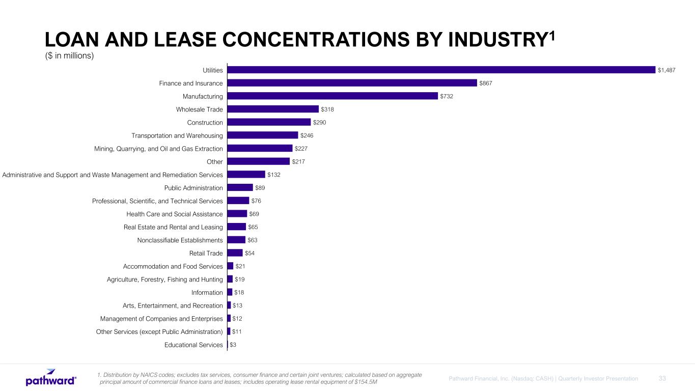33Pathward Financial, Inc. (Nasdaq: CASH) | Quarterly Investor Presentation 1. Distribution by NAICS codes; excludes tax services, consumer finance and certain joint ventures; calculated based on aggregate principal amount of commercial finance loans and leases; includes operating lease rental equipment of $154.5M $1,487 $867 $732 $318 $290 $246 $227 $217 $132 $89 $76 $69 $65 $63 $54 $21 $19 $18 $13 $12 $11 $3 Utilities Finance and Insurance Manufacturing Wholesale Trade Construction Transportation and Warehousing Mining, Quarrying, and Oil and Gas Extraction Other Administrative and Support and Waste Management and Remediation Services Public Administration Professional, Scientific, and Technical Services Health Care and Social Assistance Real Estate and Rental and Leasing Nonclassifiable Establishments Retail Trade Accommodation and Food Services Agriculture, Forestry, Fishing and Hunting Information Arts, Entertainment, and Recreation Management of Companies and Enterprises Other Services (except Public Administration) Educational Services ($ in millions) LOAN AND LEASE CONCENTRATIONS BY INDUSTRY1
