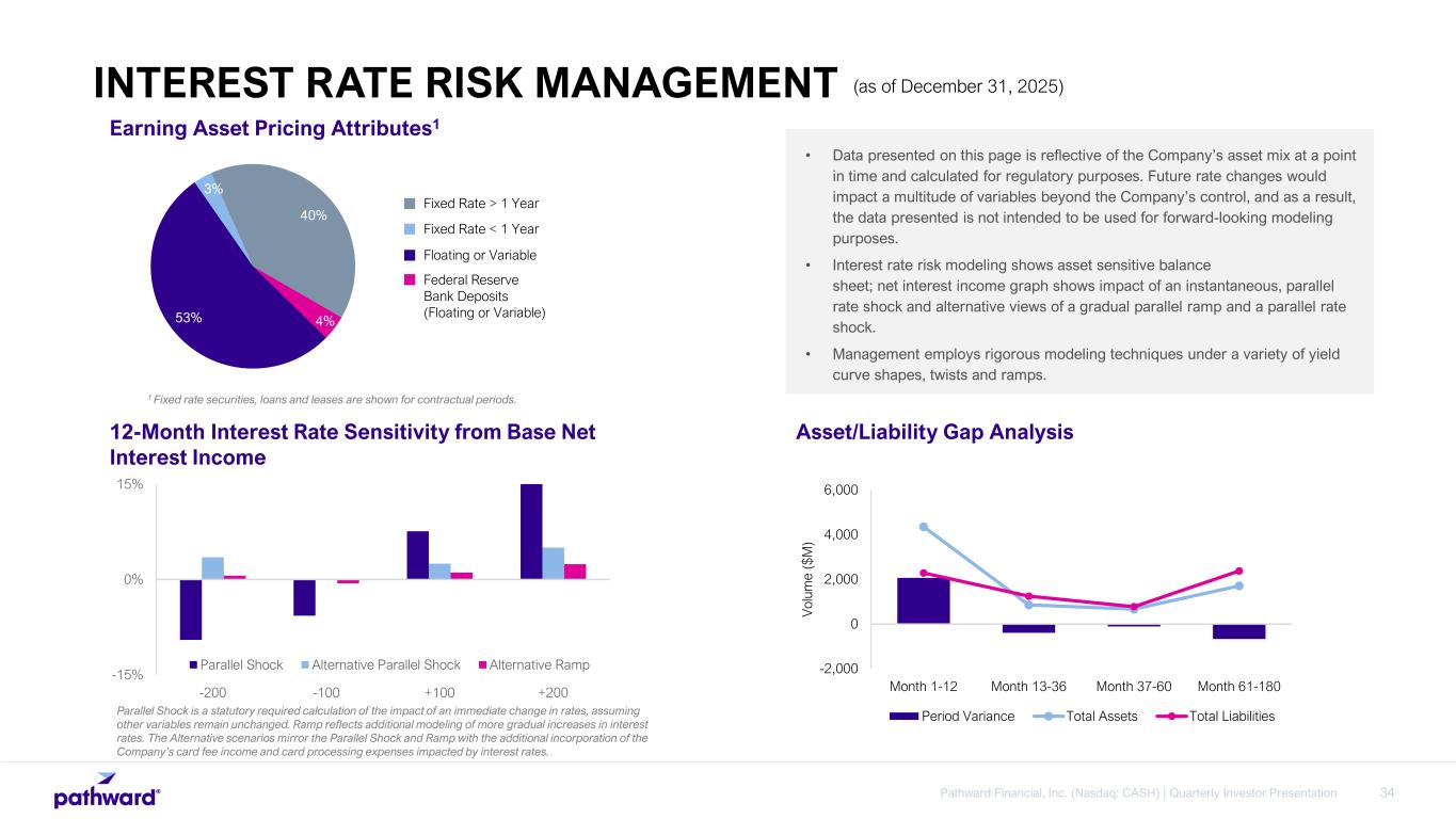34Pathward Financial, Inc. (Nasdaq: CASH) | Quarterly Investor Presentation Asset/Liability Gap Analysis 1 Fixed rate securities, loans and leases are shown for contractual periods. 4%53% 3% 40% Fixed Rate > 1 Year Earning Asset Pricing Attributes1 Fixed Rate < 1 Year Floating or Variable Federal Reserve Bank Deposits (Floating or Variable) • Data presented on this page is reflective of the Company’s asset mix at a point in time and calculated for regulatory purposes. Future rate changes would impact a multitude of variables beyond the Company’s control, and as a result, the data presented is not intended to be used for forward-looking modeling purposes. • Interest rate risk modeling shows asset sensitive balance sheet; net interest income graph shows impact of an instantaneous, parallel rate shock and alternative views of a gradual parallel ramp and a parallel rate shock. • Management employs rigorous modeling techniques under a variety of yield curve shapes, twists and ramps. -15% 0% 15% -200 -100 +100 +200 Parallel Shock Alternative Parallel Shock Alternative Ramp 12-Month Interest Rate Sensitivity from Base Net Interest Income Parallel Shock is a statutory required calculation of the impact of an immediate change in rates, assuming other variables remain unchanged. Ramp reflects additional modeling of more gradual increases in interest rates. The Alternative scenarios mirror the Parallel Shock and Ramp with the additional incorporation of the Company’s card fee income and card processing expenses impacted by interest rates. -2,000 0 2,000 4,000 6,000 Month 1-12 Month 13-36 Month 37-60 Month 61-180 V ol um e ($ M ) Period Variance Total Assets Total Liabilities INTEREST RATE RISK MANAGEMENT (as of December 31, 2025)